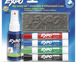 EXPO Low Odor Dry Erase Marker Set with White Board Eraser and Cleaner, Chisel Tip Dry Erase Markers, Assorted Colors, 6 Piece Set with Whiteboard Cleaner Kit comes with everything you need to get started marking Consistent, skip-free writing, vibrant color options and low-odor ink make the kit perfect for classrooms and offices Spray and EXPO eraser help you erase cleanly and easily Versatile chisel tip allows for broad or fine writing Includes: Red, Blue, Green and Black dry erase markers, a 2 oz bottle of Expo white board cleaning spray, and an Expo eraser