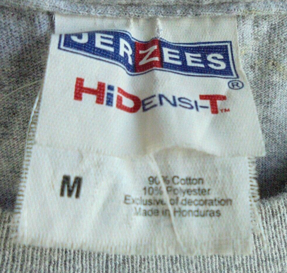 Description: Jerzees funny tshirt with graphic of plaid suit vest and bow tie and four leaf clovers on front. "Lucky" text. Green against gray tee.