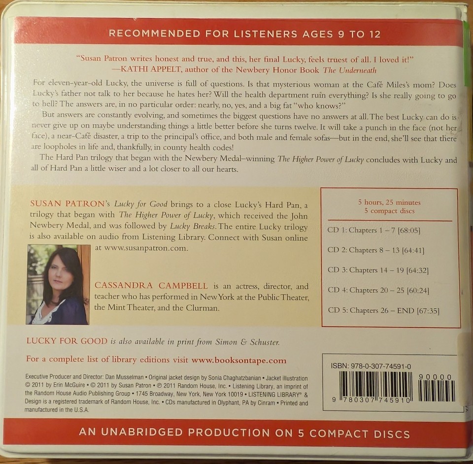 Immerse yourself in *Lucky for Good* by Susan Patron, the heartfelt conclusion to the Hard Pan trilogy! This **unabridged audiobook on 5 CDs** is read by acclaimed narrator **Cassandra Campbell**, bringing Lucky?s journey to life with warmth and authenticity.