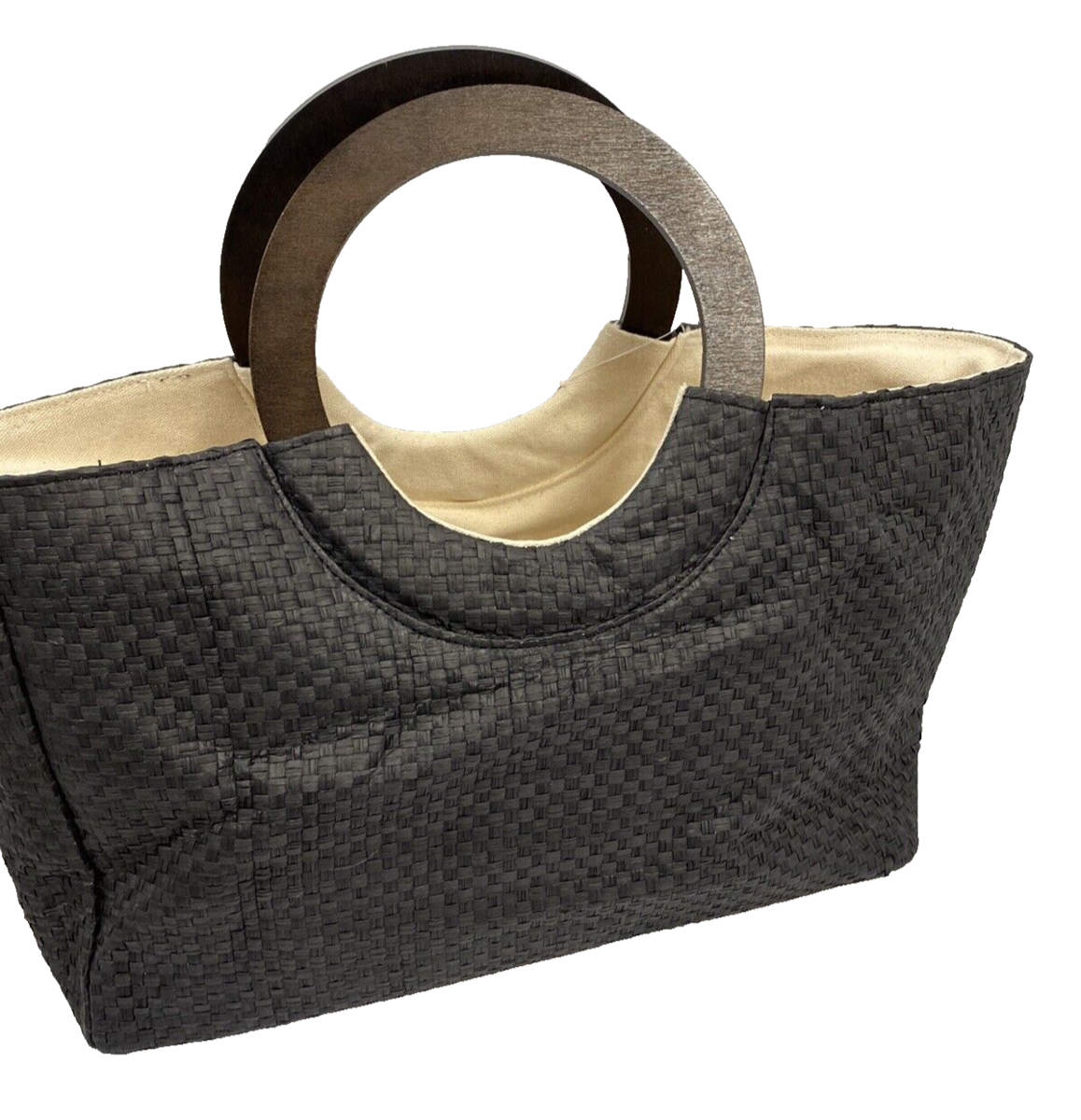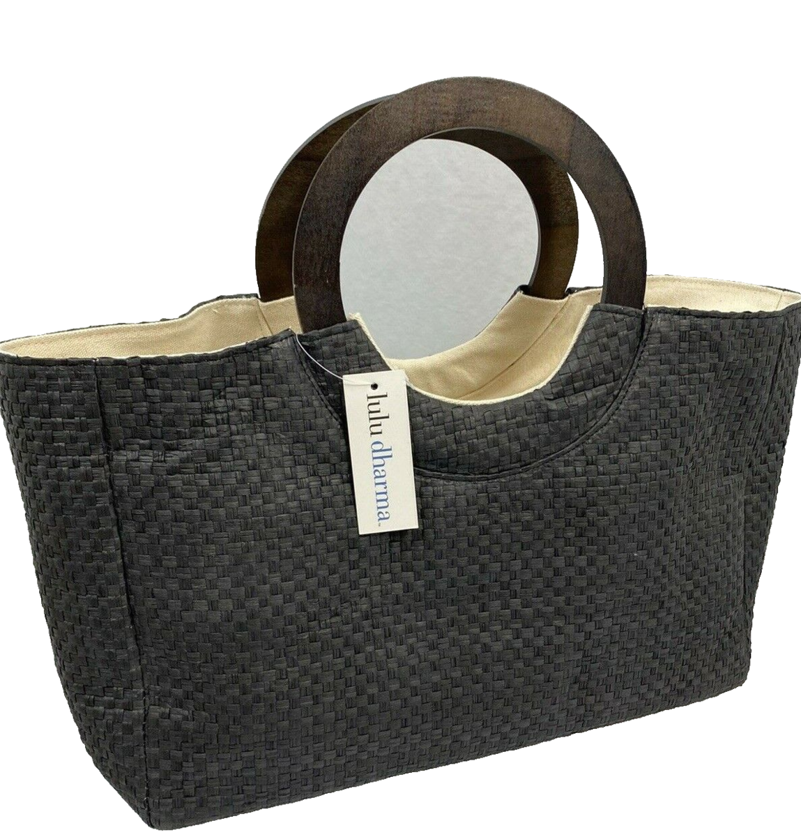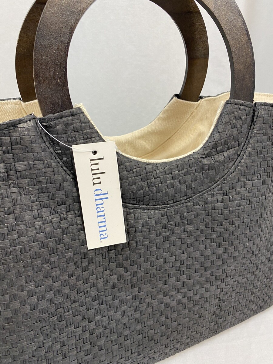 New with tags! Lulu Dharma Black Basket Woven Tote Black Basket Woven Wood Round Handles Burlap Lined One open pocket one Zipper Pocket Measures: 19in wide x 10 in high x 4.5 deep Very Good Condition. See all photos. I am happy to combine shipping and only charge actual shipping charges. My goal is always 100% complete customer satisfaction. If you feel your item has arrived "not as described", please contact me to arrange for return/refund before leaving feedback. I am a trading assistant. I can sell your items for you! |AMS-AS|