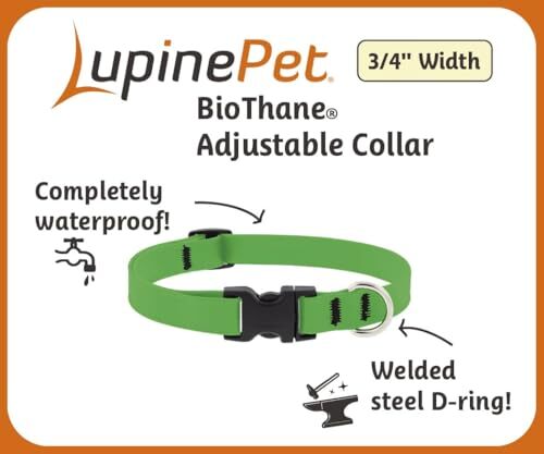 Product description: Adventure-ready, waterproof, and built to last?this is the perfect choice for active dogs who love to get messy! Made from BioThane USA?s innovative coated webbing and proudly built in NH, this collar combines durability, comfort, and effortless maintenance in a sleek, stylish design. Whether rolling in the mud, splashing in the rain, or exploring in the snow?it is stain-resistant and super easy to clean. The smooth, soft, and flexible material is gentle on both hands and fur while still maintaining incredible strength. With reinforced stitching and sturdy hardware, it can handle even the most energetic pups while remaining lightweight and comfortable. The flat collar, adjustable design provides a secure, comfortable fit and comes in three size ranges for small to large dogs (additional sizes offered in our 1? width.) It includes a custom designed, strong, quick-release YKK buckle and a welded, heavy-duty, nickel-plated steel D-ring for secure yet easy leash and ID tag attachment. Matching leashes, harnesses and other accessories are available. Please note that all items are handmade. Because they are cut and sewn by hand, here at our workshop in NH, measurements may vary slightly.
