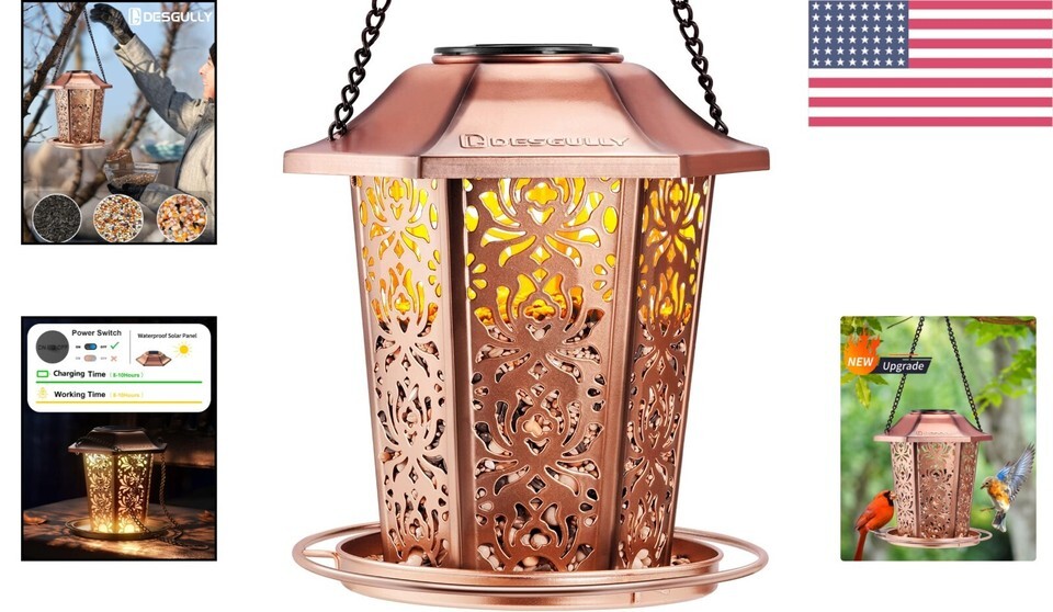 Enhance your yard, garden, or patio with this exquisite solar bird feeder that doubles as a stunning lantern at night. Designed with bird lovers in mind, it ensures a continuous supply of seeds while offering a visually appealing ambiance. With an impressive capacity, robust all-weather construction, and a commitment to attracting a variety of birds, this feeder is a must-have for anyone seeking to indulge in nature.