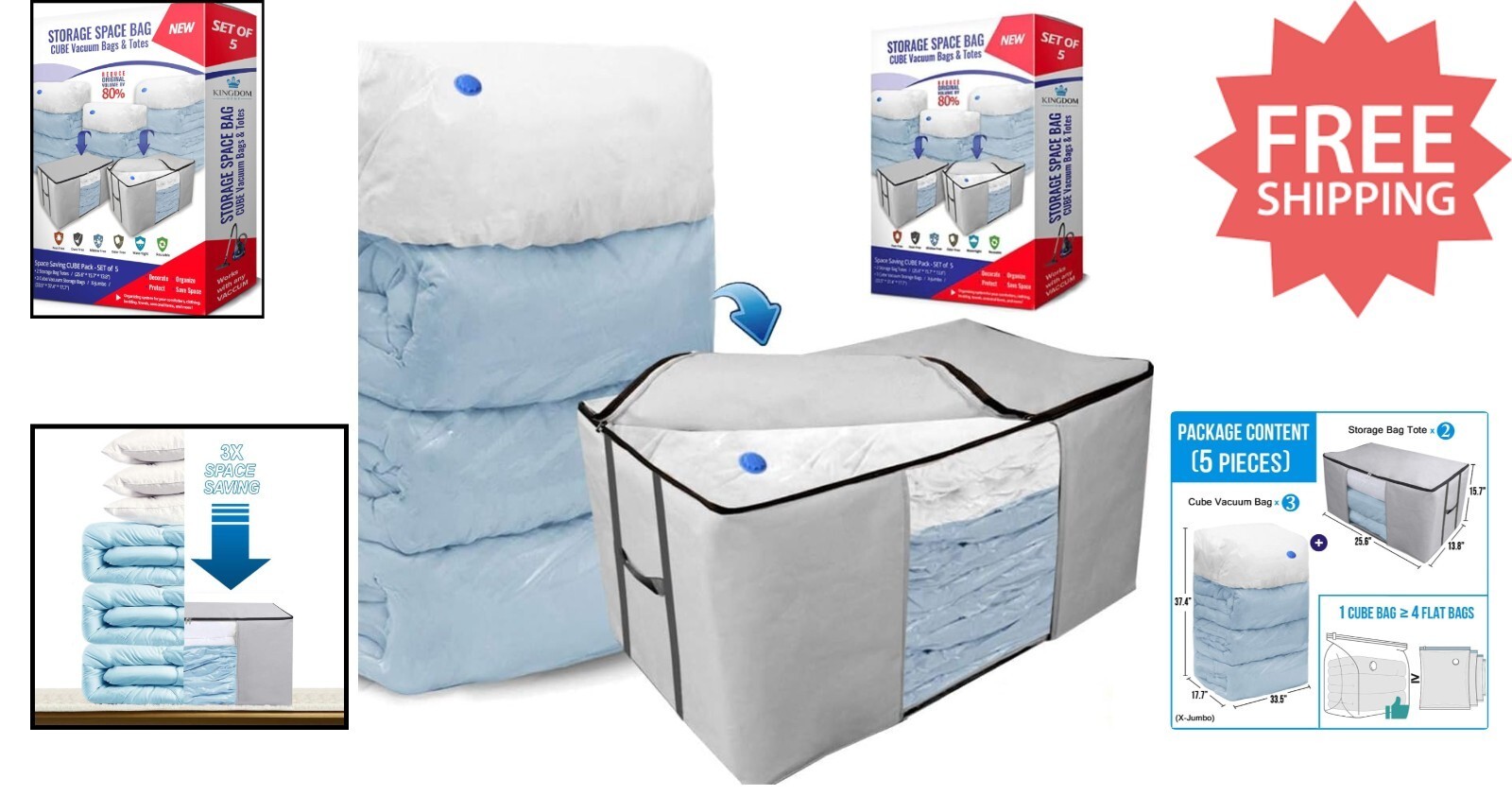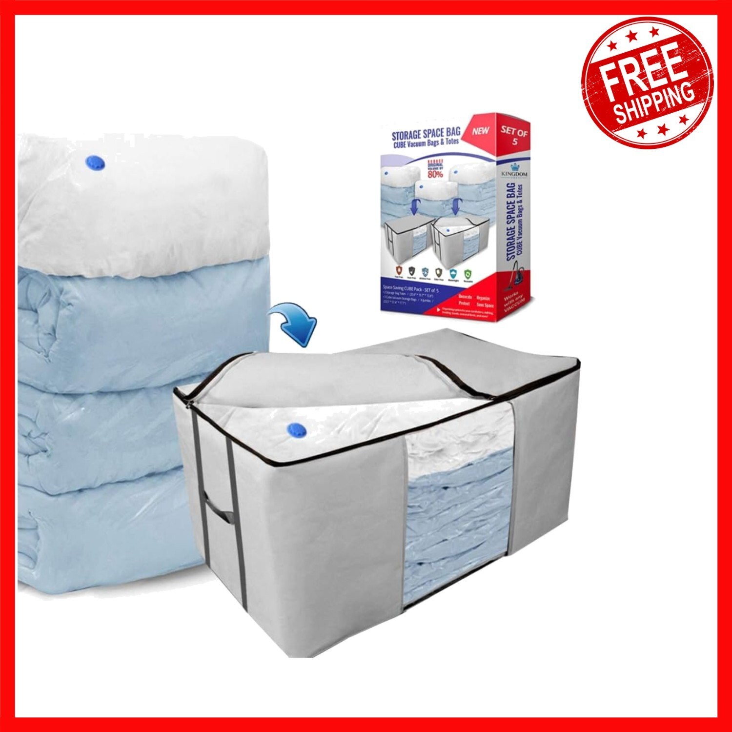 Maximize your storage space with the Kingdom Home Storage Space Bag Set, a stylish and versatile solution designed to help you declutter and organize with ease. Includes durable, breathable tote bags and efficient cube vacuum bags that save up to 80% space, perfect for tackling blankets, clothing, holiday decorations, and more. The elegant design fits seamlessly into any home decor, and the set is reusable, waterproof, and easy to use. Plus, 12% of profits support charitable causes. Experience storage and make a positive impact today!