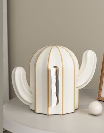 Product description: Transform your living space with this striking cactus-shaped tissue box dispenser that marries form and function in perfect harmony. The sleek black finish adorned with elegant gold vertical accents creates a sophisticated statement piece measuring 10.2 x 5.1 x 7.9 inches. This artfully designed dispenser features a discreet opening that maintains the sculptural integrity of the desert-inspired form while allowing smooth tissue access. Perfect for contemporary homes, this versatile piece adds a touch of whimsy and refinement to coffee tables, dining areas, bathroom counters, or office desks. The durable construction ensures lasting beauty, while the timeless black and gold color palette complements various interior styles from modern minimalist to southwestern chic. Make everyday moments more elegant with this unique blend of practical design and artistic expression that turns a simple tissue box into a conversation-worthy decorative accent.