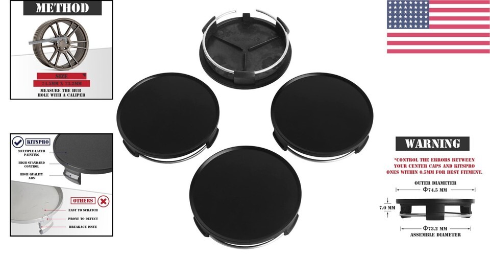 - Luxury Matte Black Wheel Center Caps - 75MM Outer, Easy Install, 4 Pack