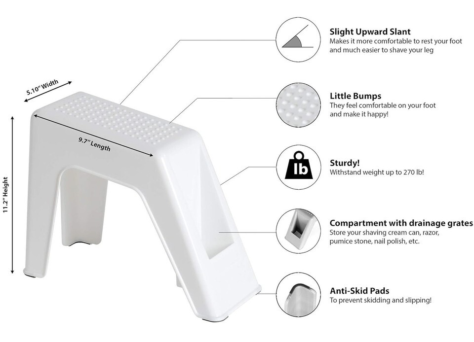Features: Anti-skid Pads,Sturdy,Lightweight,Comforting Surface Bumps,Compact Size,Upward Slant,Storage Compartment,Back Support,Hold Weight Up to 270 lb