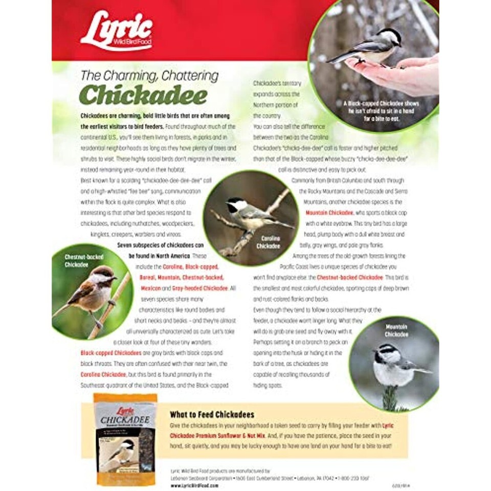 Lyric Chickadee was created to attract the cute, little, "formal" and friendly chickadee to your backyard. Chickadees like seeds like black oil and black striped sunflower for the kernels they contain. Lyric Chickadee contains these two seeds as well as the shelled kernels. Additionally, this mix contains shelled peanuts, pecans and pistachios. This quality mix will attract chickadees, but can also bring titmice, woodpeckers, nuthatches and other songbirds to your backyard. This mix will work with a wide variety of feeders. You may want to even try putting some in your open hand and see if these birds will accept your invitation. Try Chickadee by Lyric, developed by experts with the finest nutrients, you'll see the difference.