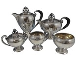 Modernism sterling silver 5-piece tea set marked #600 made by M. Fred Hirsch Co. of New Jersey c1920-45. The tea set features 3-D cast ball and leaf elements on the finial and by the ebony handles. The set includes: