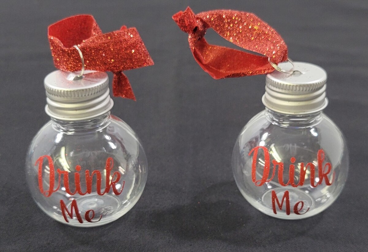 Festive Boozeballs Christmas Tree Holiday Ornaments Bottles Set of 2 Each measures about 2-1/2" high with an approximate 2" diameter Ornaments are in overall good condition that have never been filled and only displayed.