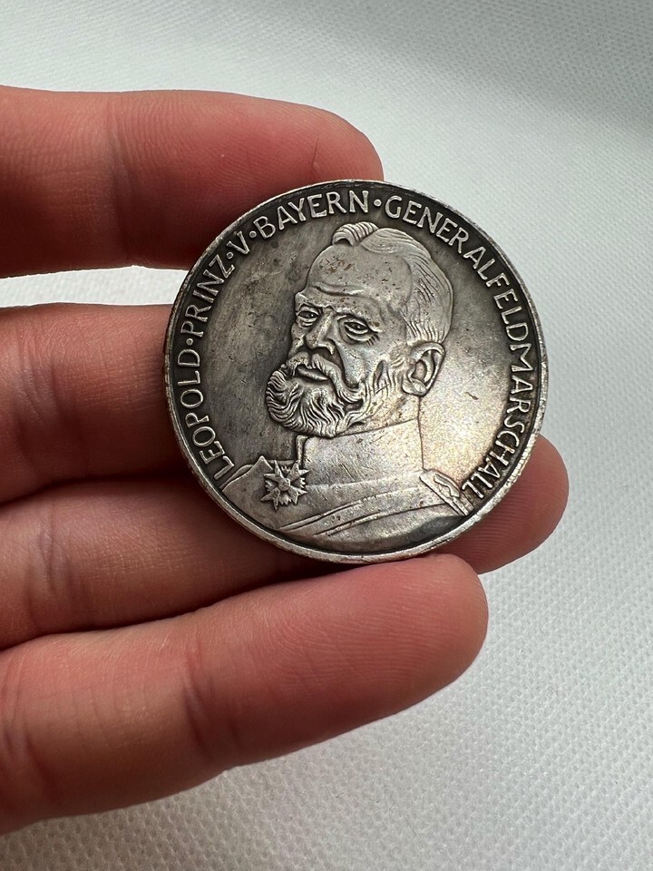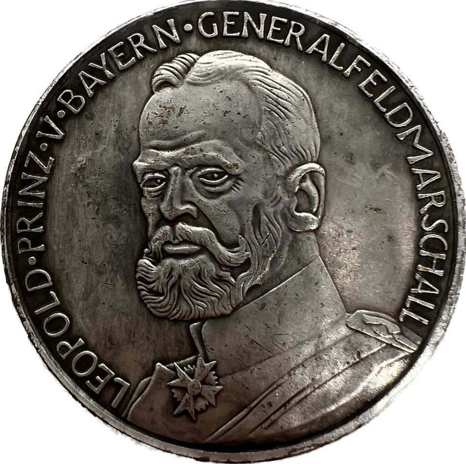 Cette medaille commemorative fantastique honore le general Leopold, le prince de Baviere qui a joue un role central pendant la Premiere Guerre mondiale, en particulier lors de la bataille de Varsovie en 1915. L'avers de la medaille presente un portrait detaille du Generalfeldmarschall Leopold, represente en uniforme avec des expressions d'honneur et de determination. En tant que figure eminente de la famille royale bavaroise, Leopold est repute pour sa carriere militaire, menant les forces allemandes a la victoire dans cette bataille importante. Le dessin de la medaille comprend une croix du merite gravee sur sa poitrine, symbolisant son grade militaire estime.
