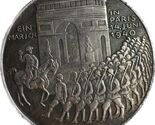 Au revers, la medaille presente une representation frappante de l'armee allemande marchant a travers Paris le 14 juin 1940, un evenement au cours duquel les forces allemandes sont passees ceremoniellement sous l'Arc de Triomphe, symbolisant leur victoire. Fabriquee avec une attention exceptionnelle aux details, cette reproduction capture des moments significatifs de la guerre, y compris la presence de la croix gammee sur l'arche, refletant le symbolisme nazi qui represente un contexte historique maintenant considere comme un artefact documentaire de cette periode tumultueuse.
