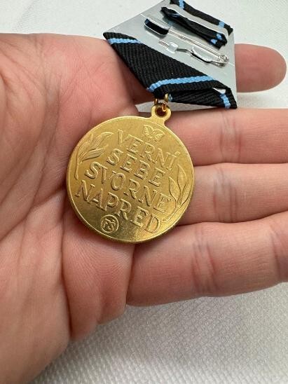 Cette conception reflete non seulement la valeur esthetique, mais transmet egalement un contexte historique et un patrimoine culturel profondement enracines. Le revers presente l'inscription "VERNÍ SEBE SVORN? NAP?ED", qui exprime des valeurs de solidarite et d'engagement, toutes deux entourees de feuilles de laurier qui symbolisent traditionnellement la victoire et l'honneur. Fabriquee avec une attention meticuleuse aux details, cette medaille reproduit fidelement le design original, ce qui en fait un ajout precieux a toute collection.