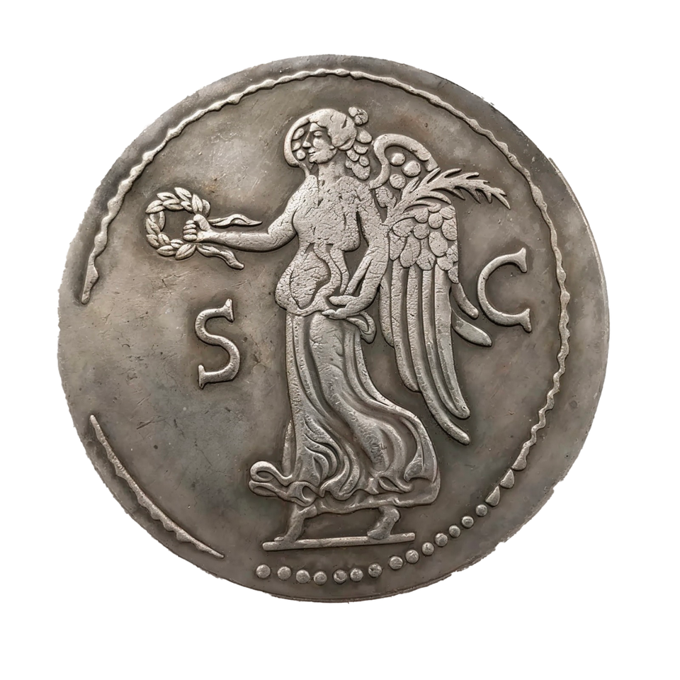 Ce medaillon commemoratif exquis represente l'empereur Galba (Servius Sulpicius Galba Caesar Augustus), dont le regne bref mais historiquement significatif (juin 68 - janvier 69 apres JC) a marque une periode turbulente de l'histoire romaine, connue sous le nom d'annee des quatre empereurs. L'avers presente un buste finement detaille de Galba, couronne de laurier - symbole d'autorite et de victoire - aux cotes de l'inscription "IMP CAESAR AVG TR SER GALBA", soulignant son statut d'empereur et d'Auguste. Bien qu'il s'agisse d'une restriction moderne, cette piece reproduit meticuleusement le style et l'art de la monnaie romaine ancienne, capturant a la fois l'authenticite historique et la grace esthetique. Le revers affiche elegamment une representation symbolique de Victoria, la deesse romaine de la victoire, tenant gracieusement une couronne, signifiant triomphe et gloire. Encadree par les lettres "S C" (Senatus Consulto), cette representation emblematique souligne l'importance de l'approbation senatoriale, un message politique crucial dans la monnaie de l'epoque. Au-dela de sa valeur numismatique, cette reproduction offre aux collectionneurs et aux historiens un lien tangible avec une epoque critique de la civilisation romaine. Son savoir-faire detaille en fait un ajout remarquable pour ceux qui sont passionnes par l'iconographie imperiale ancienne et les recits historiques que ces pieces resument.