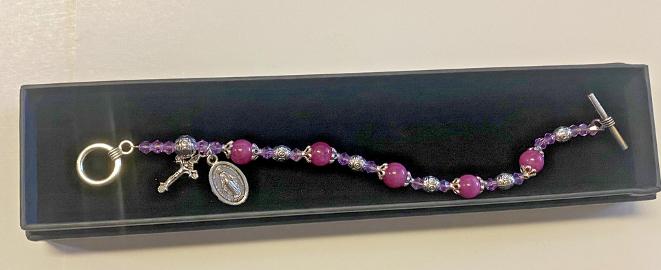 You are purchasing a very nice amethyst bead bracelet with a medal of Our Lady of the Miraculous Medal charm a Crucifix.