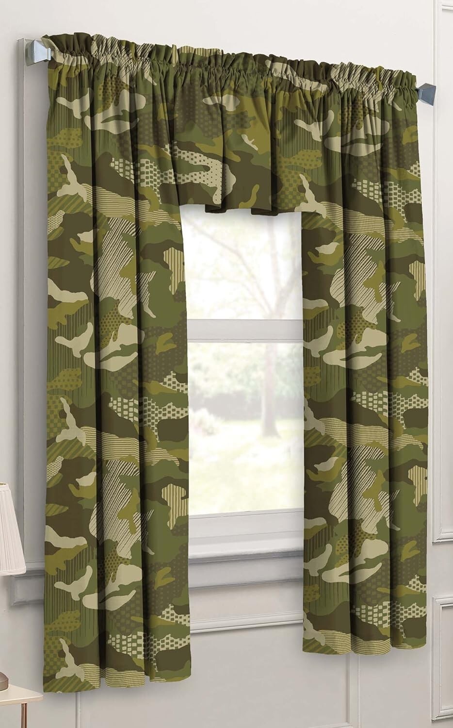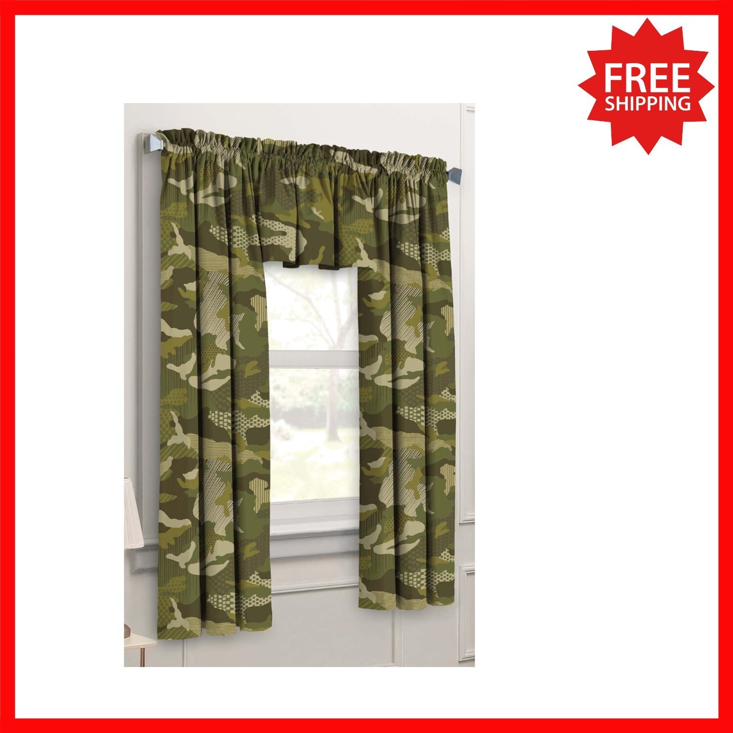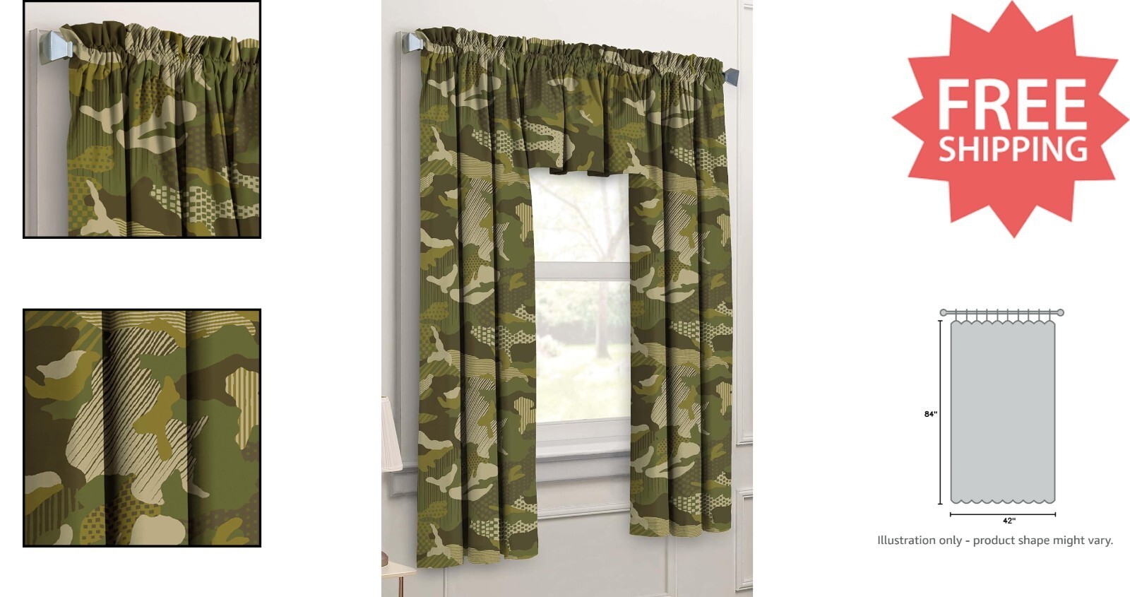 Transform your space with this stylish 3-piece camouflage window curtain set, crafted from a durable 60% cotton and 40% polyester blend. Featuring an allover geo camo pattern in forest green, olive, and khaki, these panels and a coordinating valance perfectly complement the matching camo comforter set. Designed for easy installation with extra-wide, three-inch rod pockets, the set includes two 42x63-inch panels and a 42x16-inch valance to suit standard windows. Machine washable and imported for quality assurance. Complete your camo-themed bedroom with the matching ensemble, available separately.