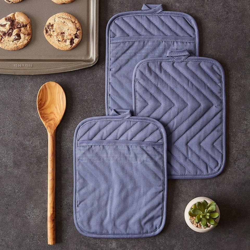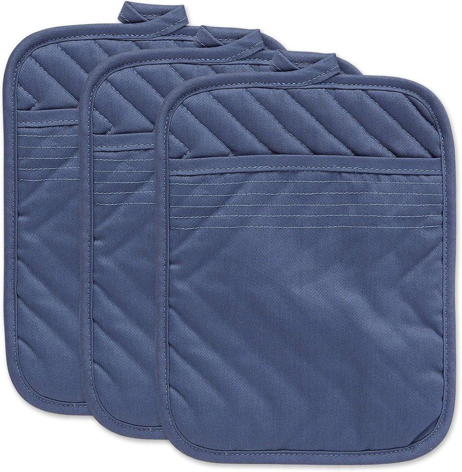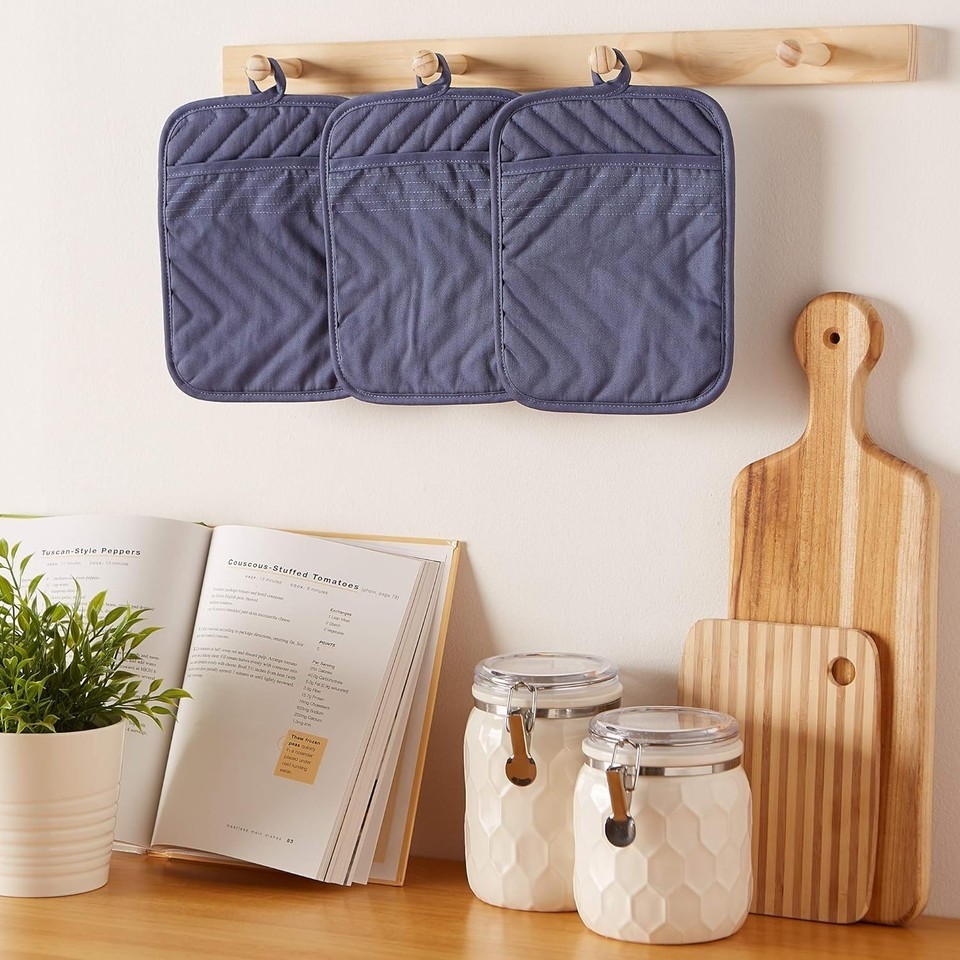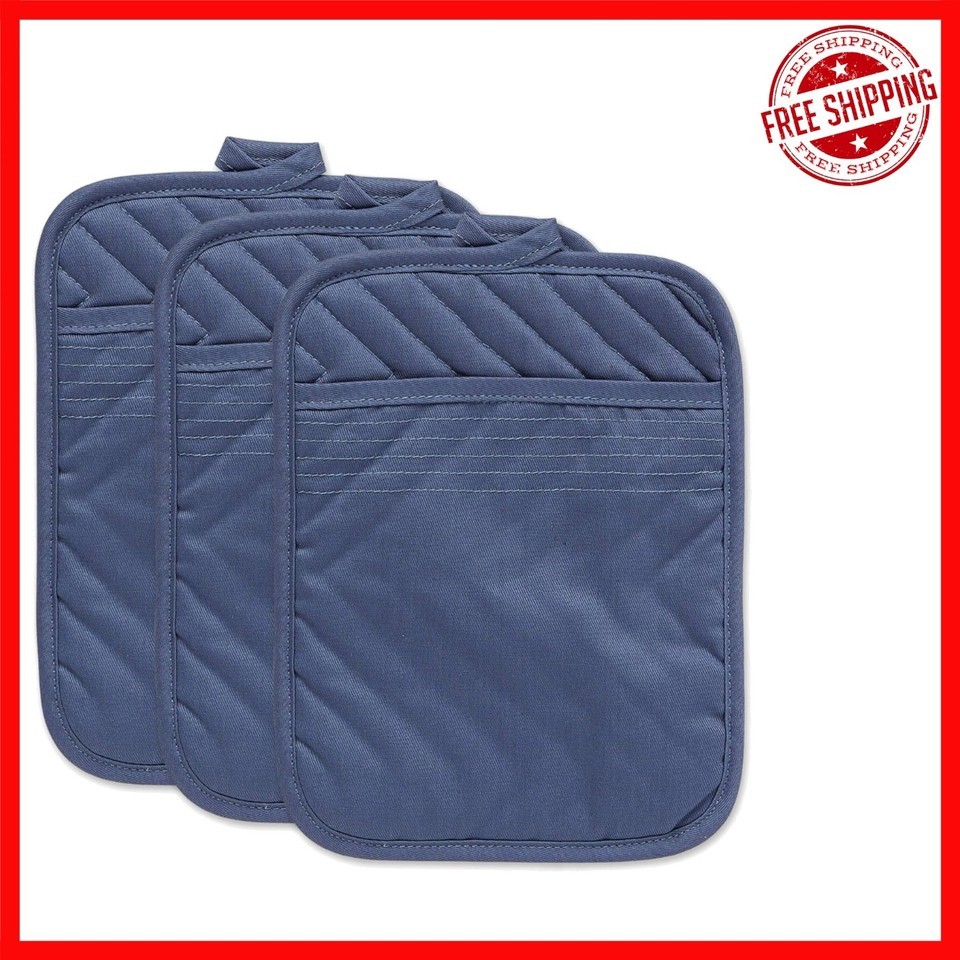 Upgrade your kitchen essentials with our set of three 100% cotton potholders, each measuring 7x9 inches and featuring convenient hanging loops for easy storage. Crafted for durability and heat resistance, these potholders safely protect your hands while removing dishes from the oven or hot pots from the stove. Designed in a variety of vibrant colors, they also offer space for customization, making them a perfect gift option. Easy to care for, simply machine wash cold on a gentle cycle and tumble dry low?do not bleach or hot dry. Part of DII's extensive collection of stylish and functional kitchen linens, these potholders are an affordable and versatile addition to any home. Whether for a first apartment, dorm, or as a thoughtful housewarming gift, they combine practicality with style.