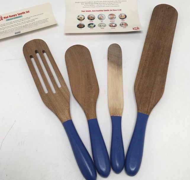 - Mad Hungry 4 Piece Spurtle Set In Acacia and Blue Silicone Handles, New