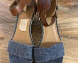 Step out in style with these chic Universal Thread denim espadrille wedge sandals. Featuring a playful blue denim upper with a subtle floral pattern, these sandals are perfect for spring and summer. The comfortable brown faux leather ankle strap with a buckle closure ensures a secure fit, while the espadrille wedge heel adds a touch of bohemian flair. These sandals are in good used condition with little wear on the footbed and bottom soles.
