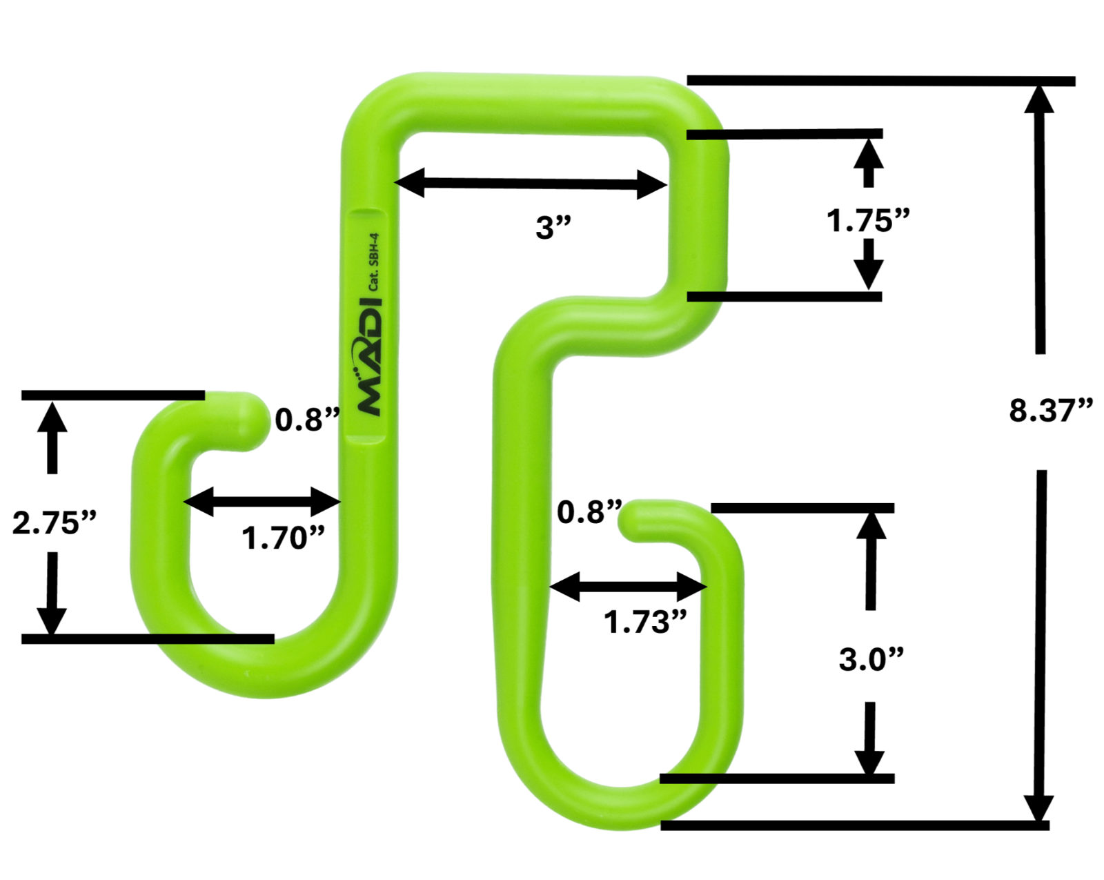 Ideal for those searching for practical and weather-resistant bucket hooks, the Madi SBH-4 boasts a high-visibility nylon build for easy identification even in low-light environments. It supports a superior working load limit, with a 150 lb. capacity on the interior hook and 100 lb. on the tapered exterior hook. The exterior arm also accommodates up to six rubber blankets or material bags. Additionally, its no-latch design offers convenient operation for users wearing heavy gloves, enhancing overall efficiency.