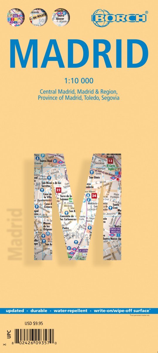 Our folded street and travel map of Madridincludes sights, museums, theatres, monuments, religious sites,castles, parking,restaurants, gas stations, camping sites, hotels, and markets. The colored map includes insetsof Madrid andRegion,Provincia de Madrid, Toledo, Segovia,and the Public TransportSystem.Climate charts show the average daily temperatures, humidity, hours of sunshine and precipitation for each month.These Borch mapsare durable, water-repellent and feature a laminated write-on/wipe off surface and measureapproximately 9.5"x4.5" when folded up and unfolds into a flat double-sided map measuring 34"x19.25".