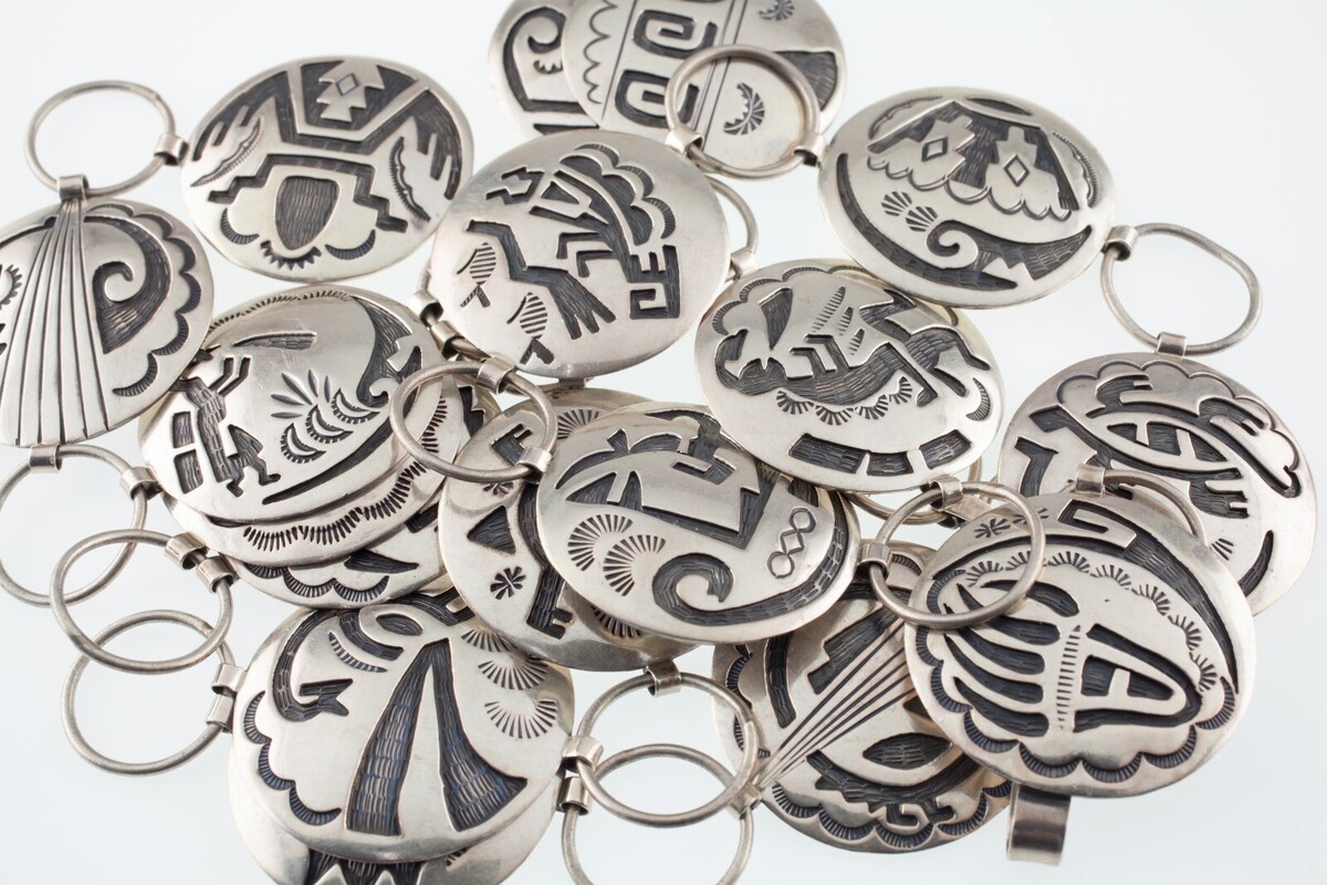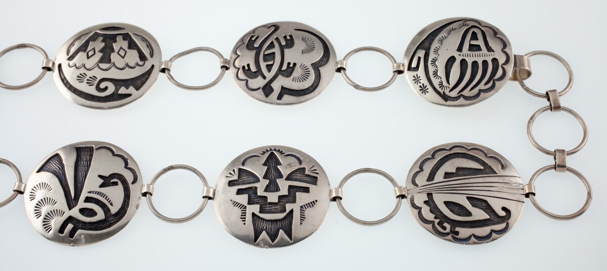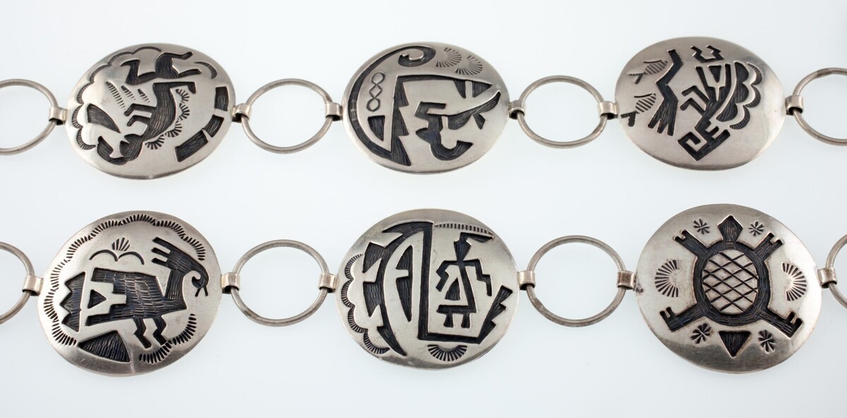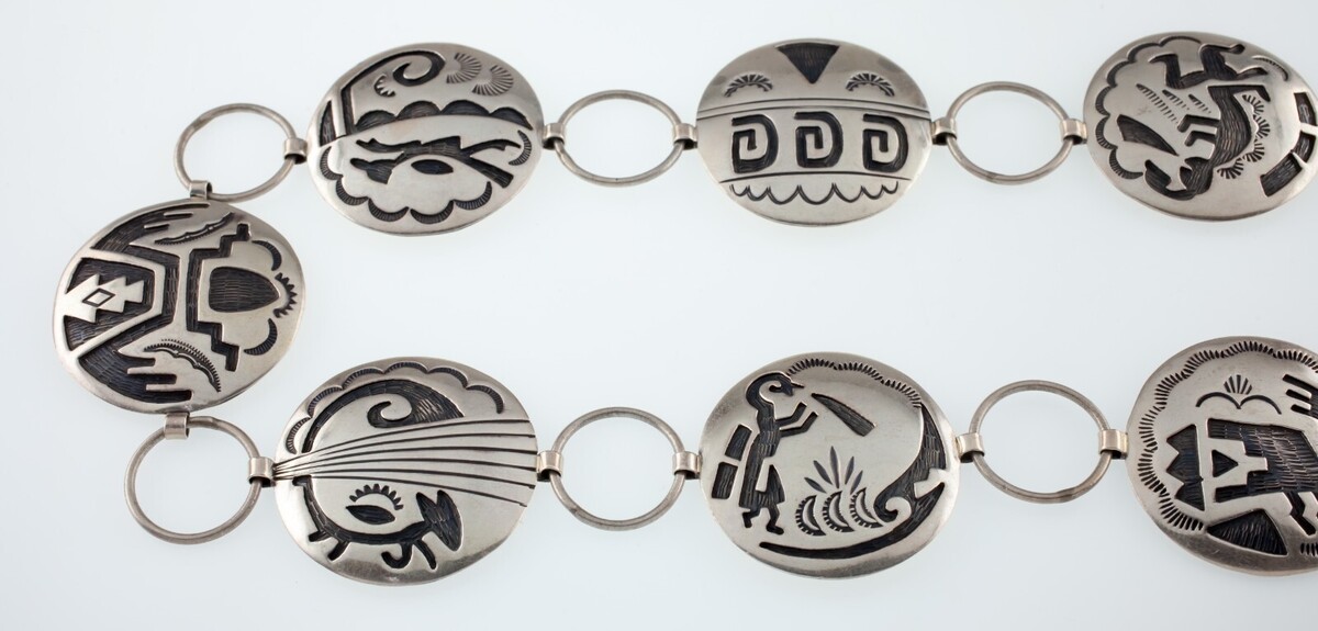 Superbe ceinture de concho en argent sterling hopi signe S. Tom, 268,8 Gr. 43 "