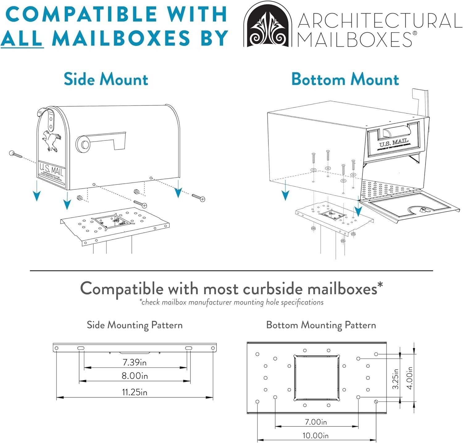 - Fits mailboxes with side-mount or under-mount hole configurations