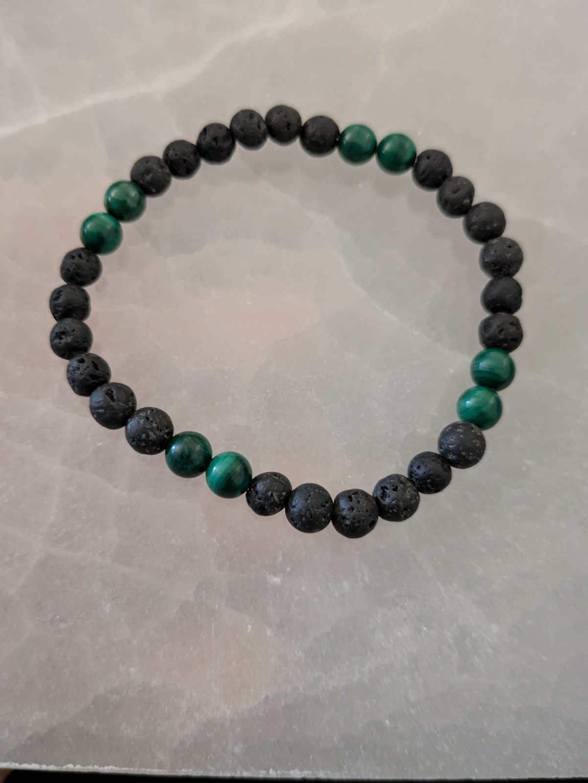 This is a beautiful malachite and lava rock bracelet made with handpicked gemstone beads. They are made by me and cleansed in a selenite bowl before being shipped.