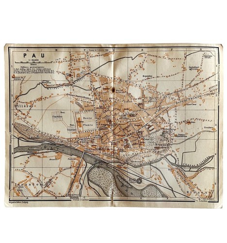 - Map Central Pau Southern France Rare 1914 Lithograph WW1 Era WHBS