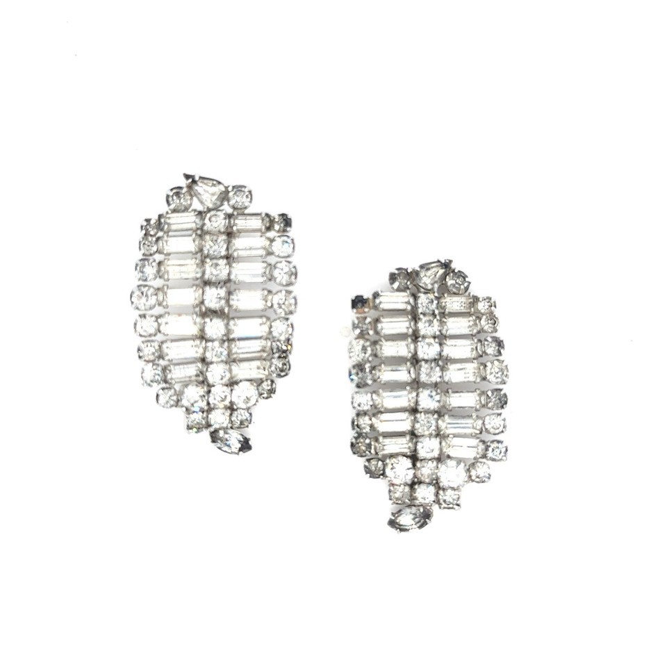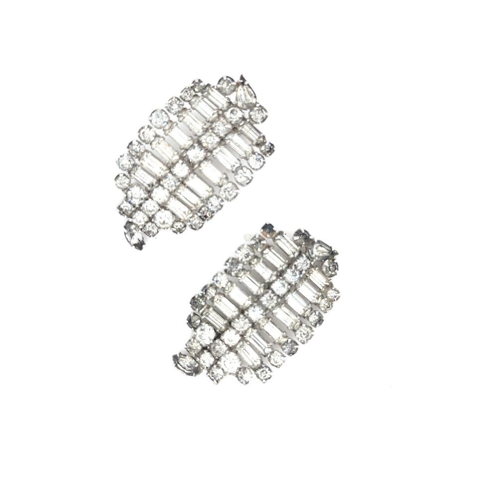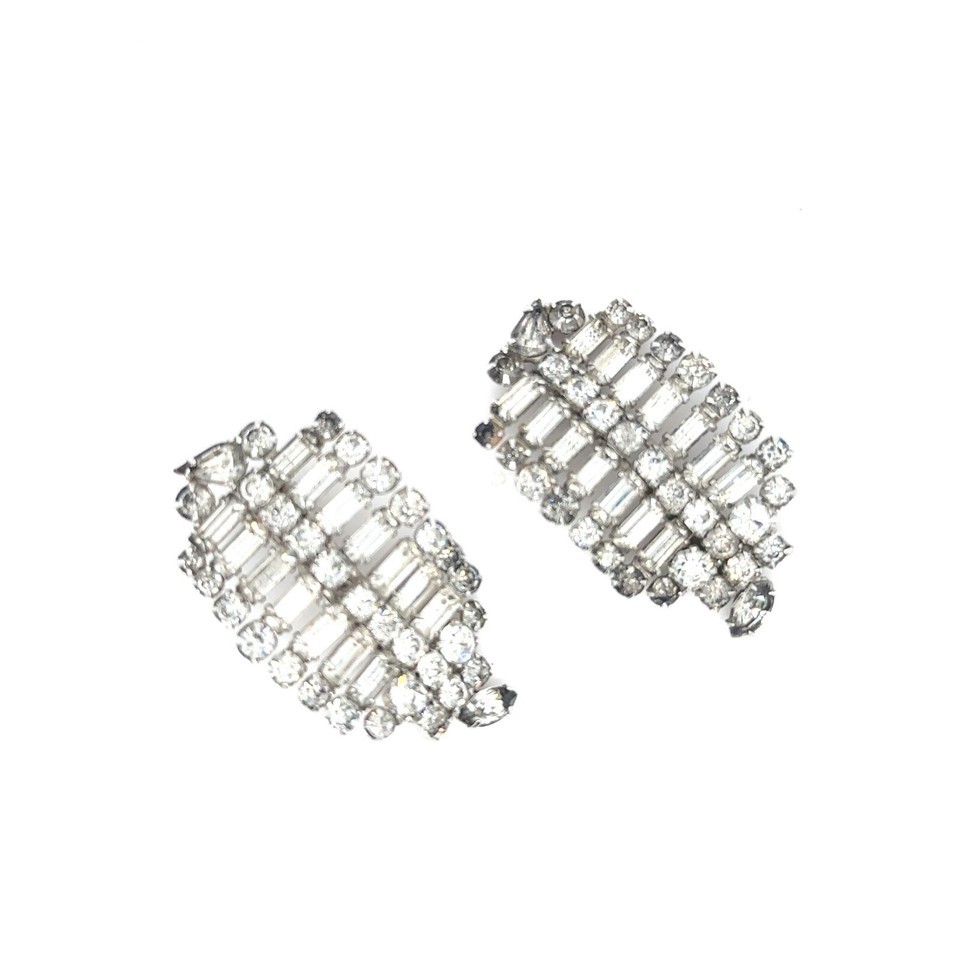 Boucles d'oreilles a clips comportant des rangees paralleles de strass alternes ronds et emeraude sertis sur griffes.