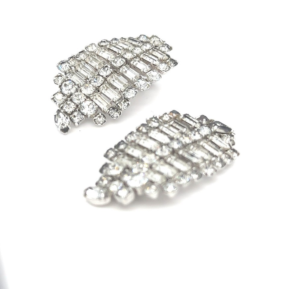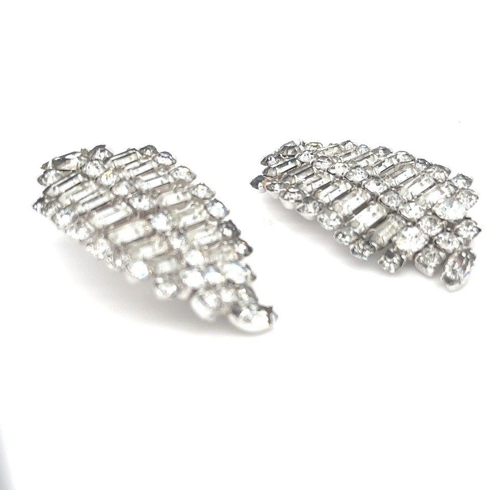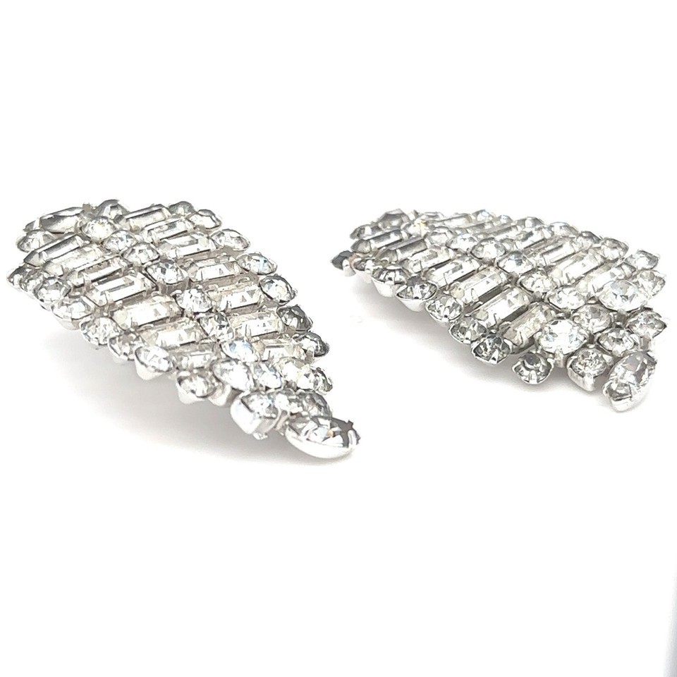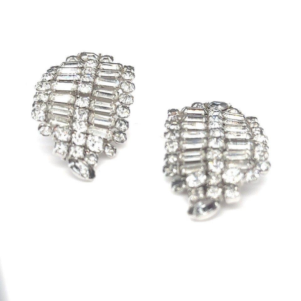 Boucles d'oreilles a clips comportant des rangees paralleles de strass alternes ronds et emeraude sertis sur griffes.