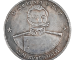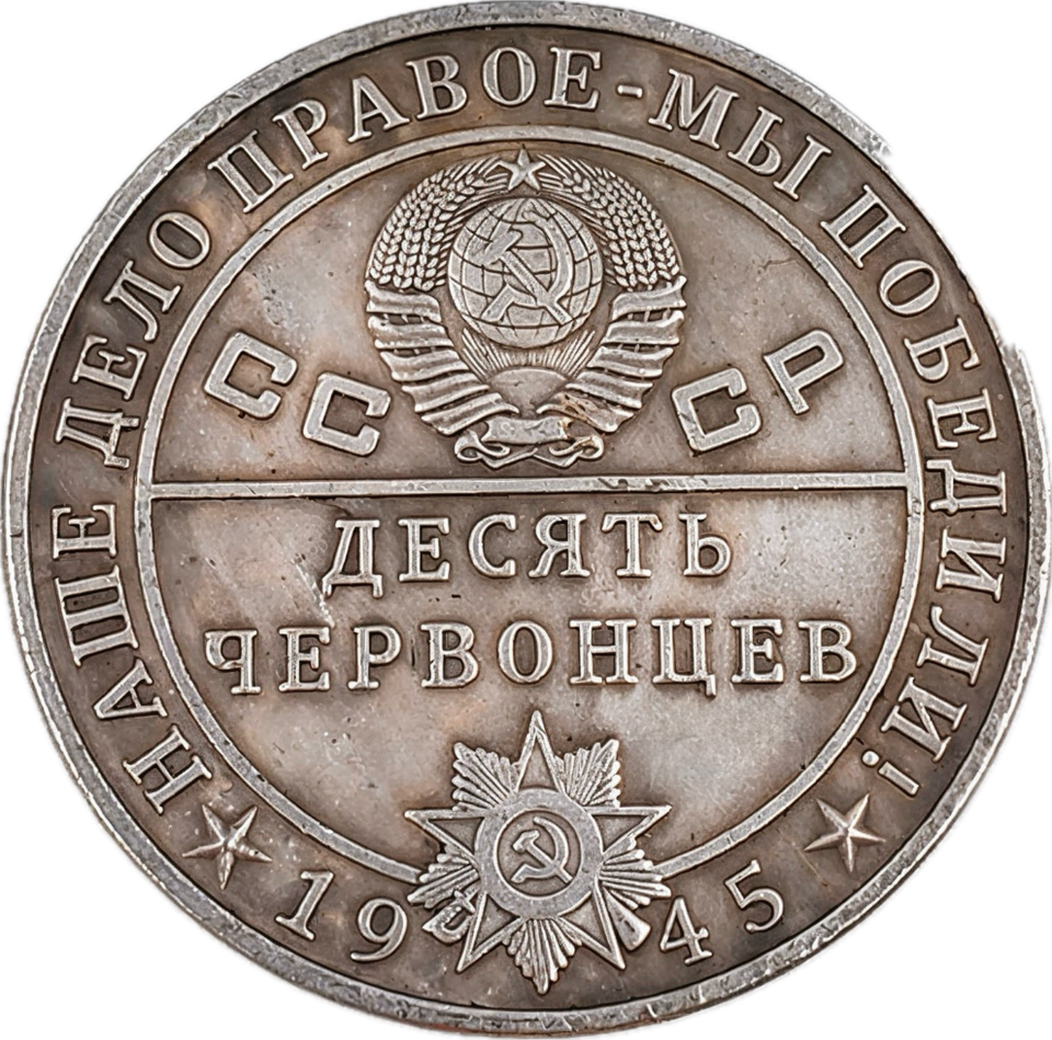 Esta moneda conmemorativa de fantasía rinde homenaje al mariscal Semyon Mikhailovich Budyonny, un famoso comandante de caballería sovietica y uno de los mariscales originales de la Union Sovietica. El anverso muestra un busto estilizado de Budyonny en uniforme completo, completo con su bigote de marca registrada y la inscripcion ?????? ??? ?.?. ????????? ("Mariscal de la URSS S.M. Budyonny"). Un celebre veterano de la Guerra Civil Rusa y una figura prominente en la doctrina militar sovietica temprana, Budyonny fue un símbolo clave de la fuerza marcial bolchevique y el prestigio tradicional de la caballería. El reverso presenta un diseño patriotico sovietico familiar utilizado en toda la serie: el escudo de armas de la URSS, "???? ????????" (Diez Chervonets), el año 1945, ¡?? ?! Esta diseñado para coleccionistas de iconografía sovietica y recuerdos militares. Representa tanto un homenaje historico como una muestra narrativa estilizada de la era de la guerra sovietica