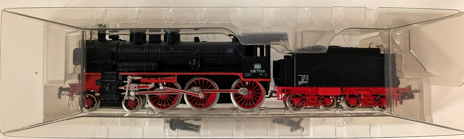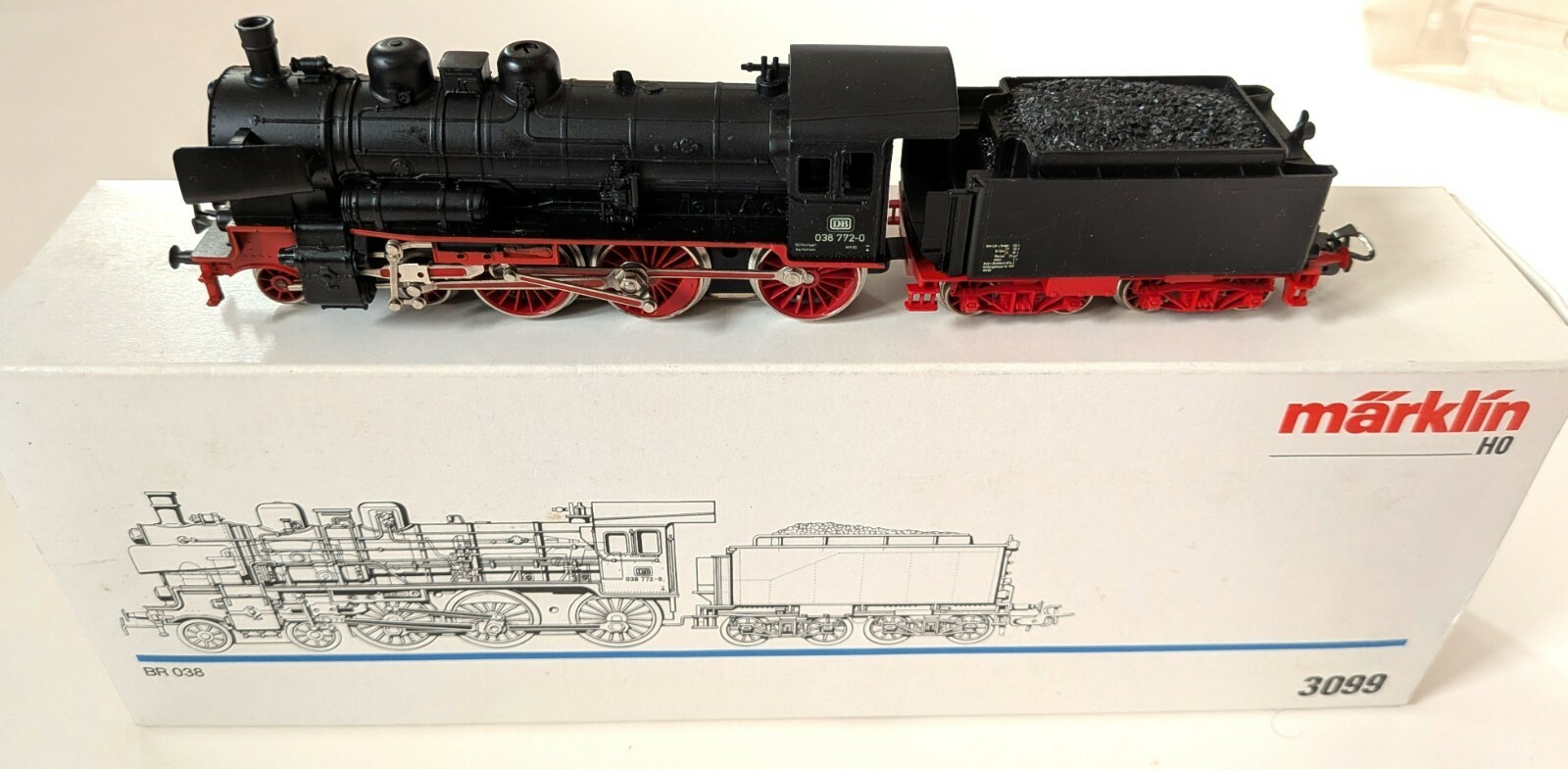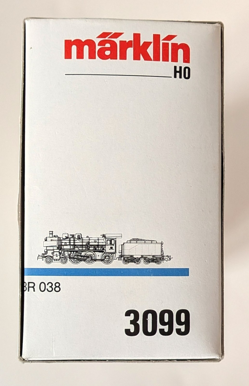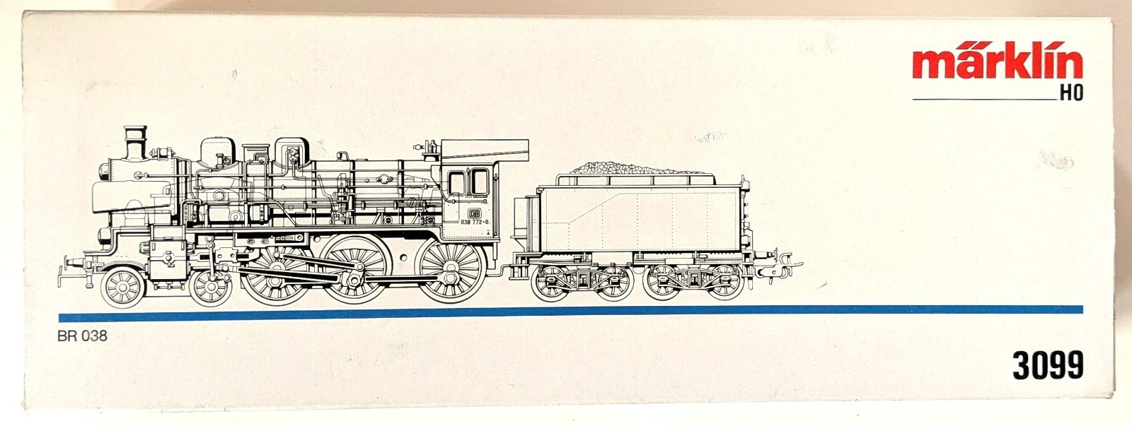 Marklin Marklin 3099 BR38 Steam Loco H0. New-old stock. Analog unit in original box with packaging and two engineer figures. Manual is missing, but I can include a downloaded version if you like. Very clean scuff-free box.