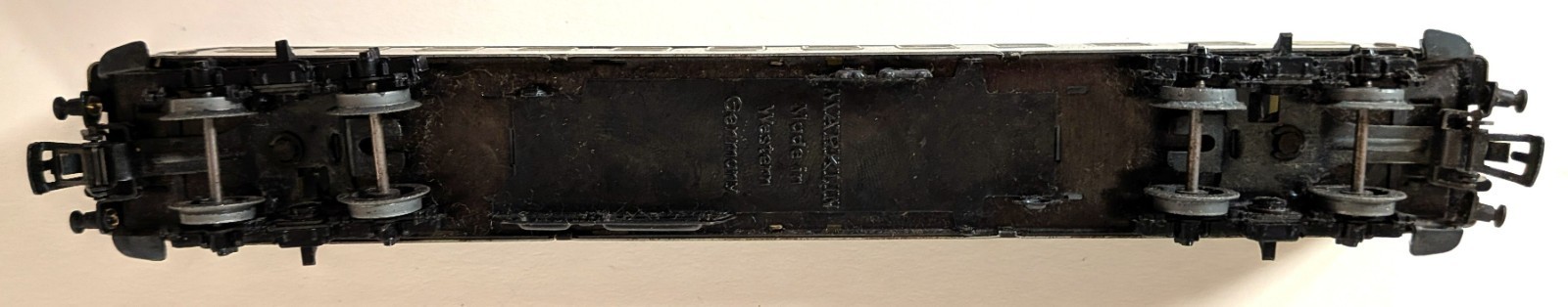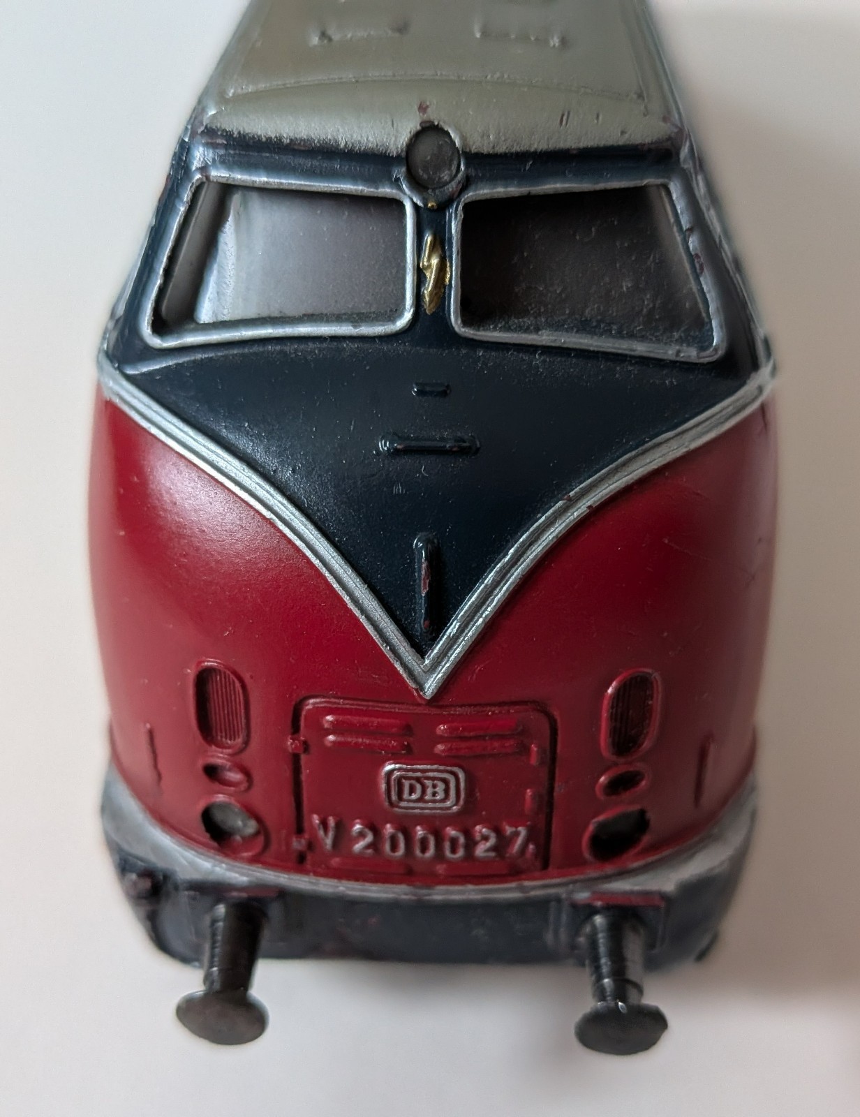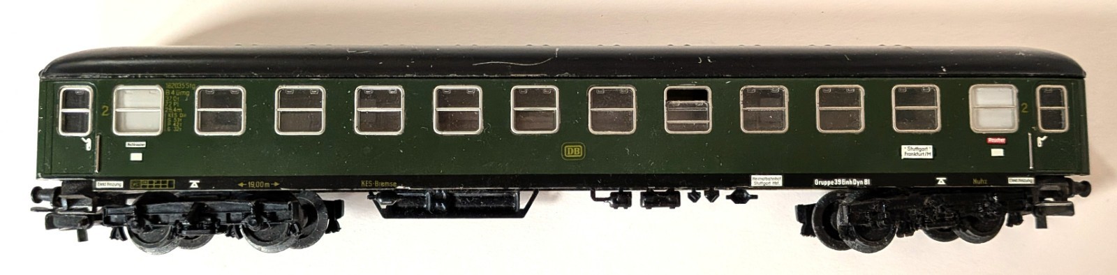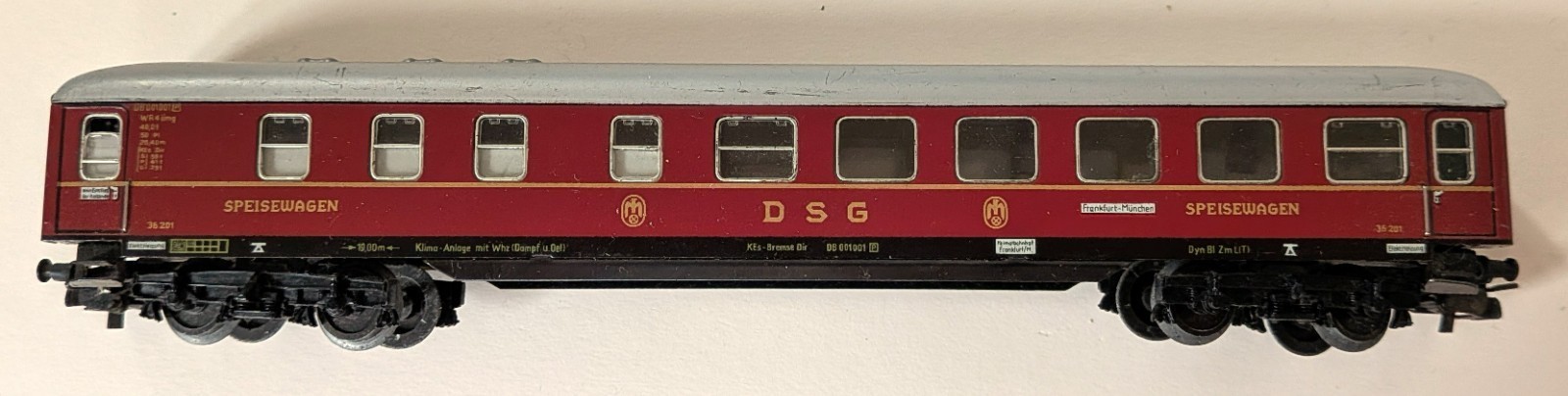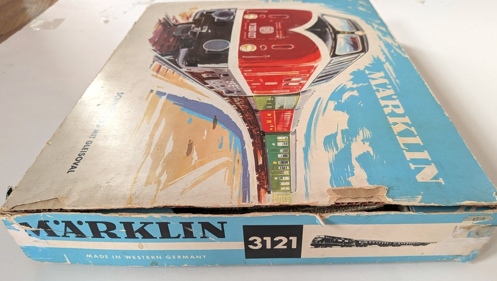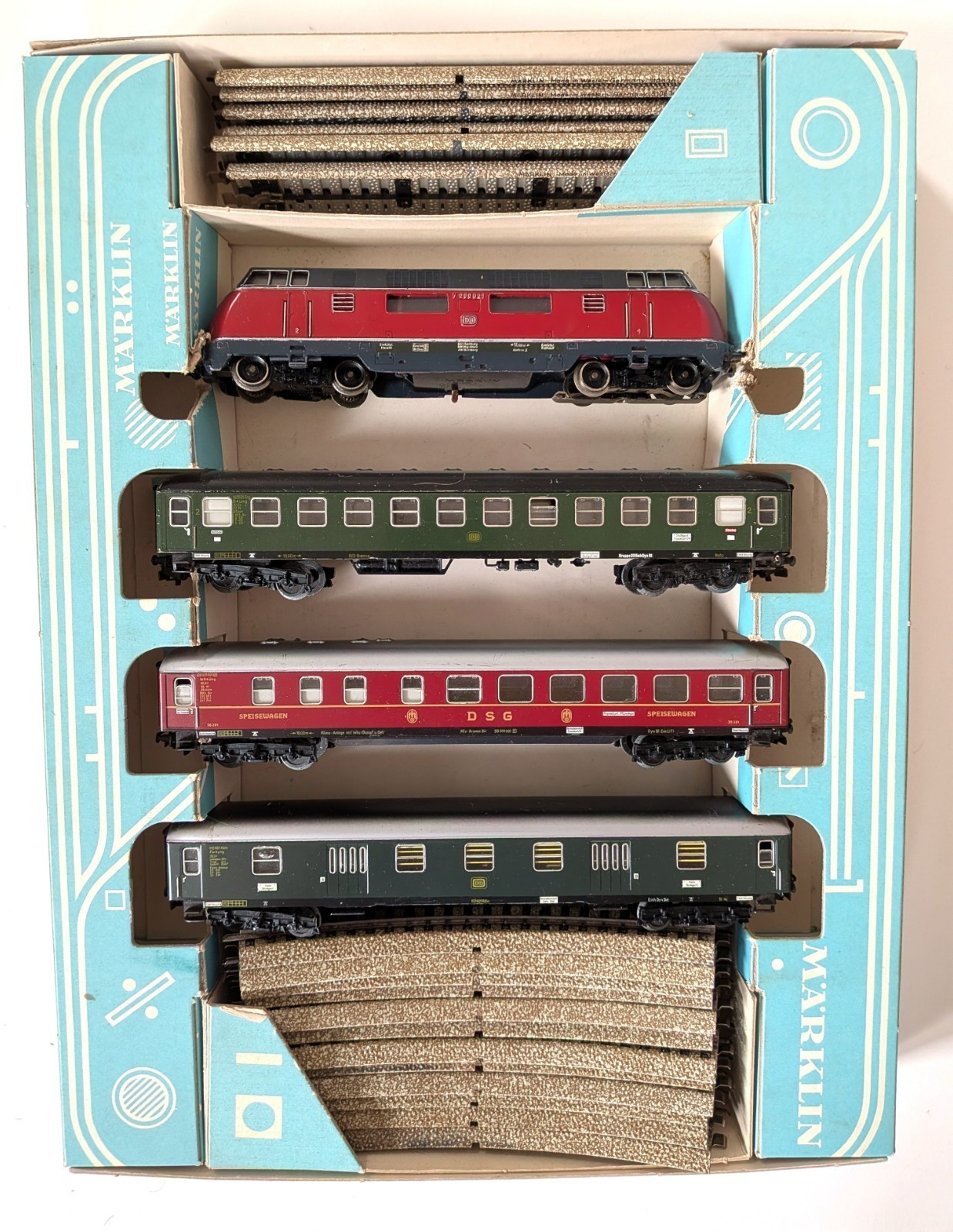 Marklin Marklin H0 3121 Train set, consisting of a V200 diesel loco, one passenger, one dining, and one baggage car plus track. Loco is equipped with different color lighting (one red, one green bulb) to indicate front and back of loco. She has been oiled and tested, and runs well. Cars are exceptionally clean with virtually no scratching on the sides. All labels are readable. Only the roofs of the cars have some scratching, see photos. The undersides of the cars are rust-free and look very good. Most of the tracks are in excellent condition - only 3 or 4 show minor rust. Box is rough (see photos) but serviceable.