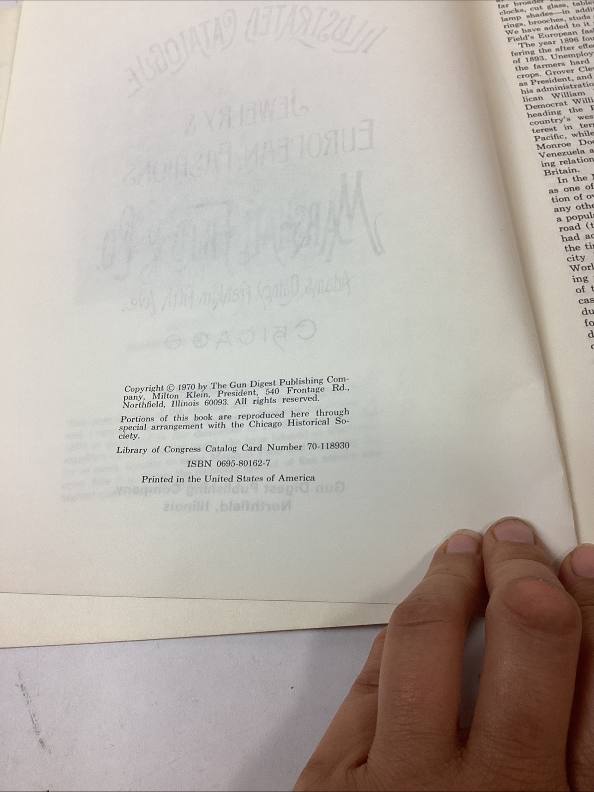 Marshall Field Co 1896 Illustrated Catalogue Chicago - 1970 Reprint. Book is in good, used condition. Softcover. There is a little staining from age. There are 378 pages which includes 38 pages of new upcoming fashionable dresses for women in 1896.