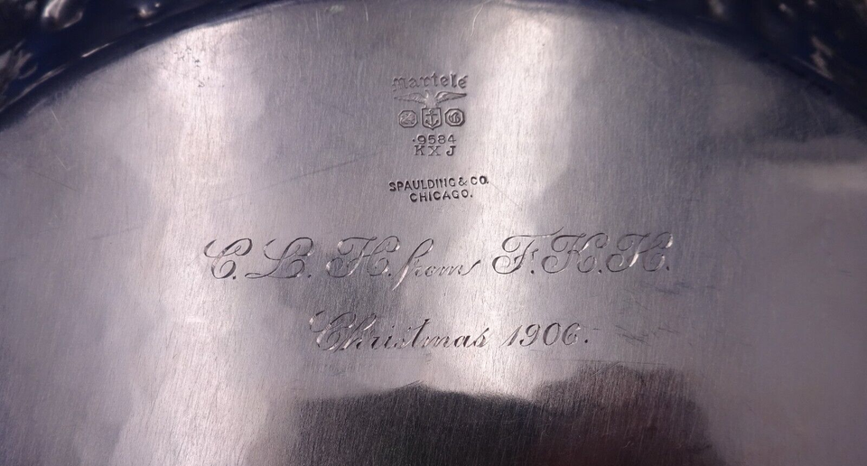 They measure 10 1/4" in diameter and weigh 20.91 troy ounces each. They have a matching monogram in the center of each as well as an inscription on the backs "CLH from FKK Christmas 1906". They are in excellent vintage condition. Museum quality.