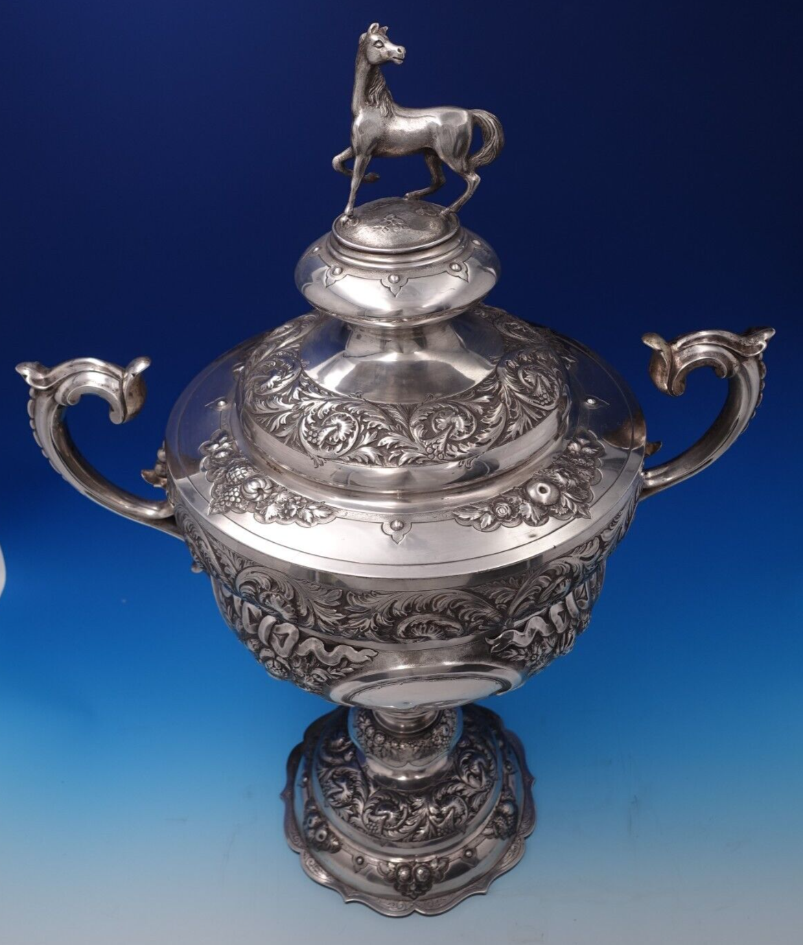 Impressive Martin Hall and Co English Victorian sterling silver trophy made in London, England, circa 1886. This piece features a 3-D horse finial with repousse flowers, fruit, ribbons, and scrollwork. It also has a gold washed interior.