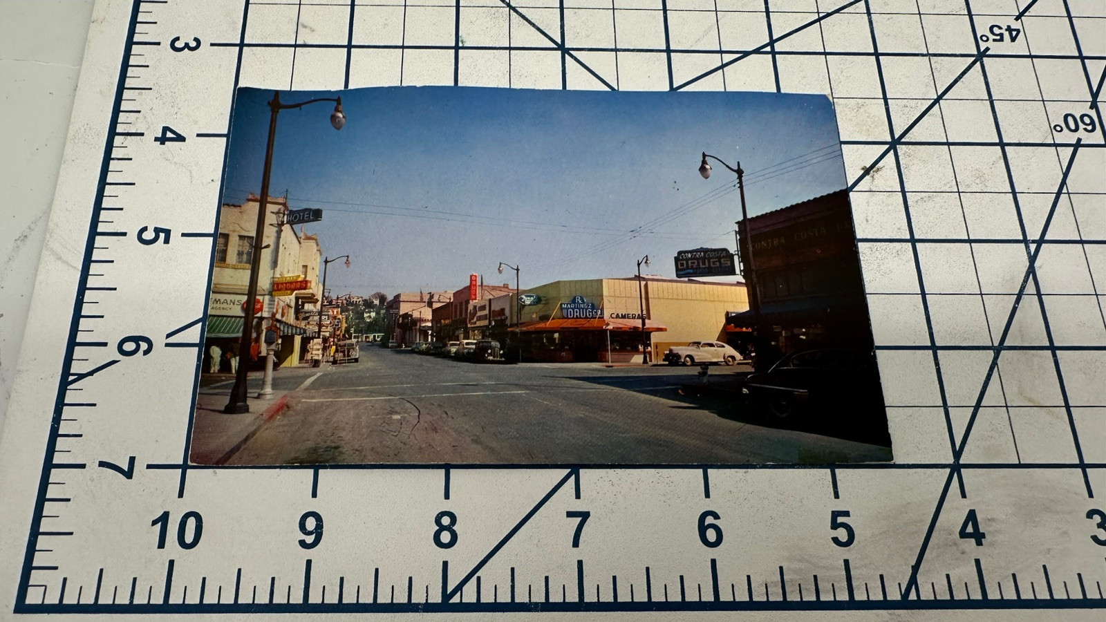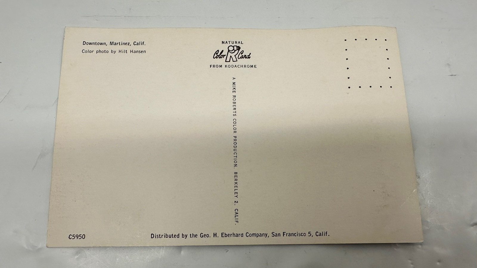 The postcard depicts Main Street in Martinez, California in the 1950s, featuring various stores and buildings. It is a real photo postcard (RPPC) showing the architecture and commercial activity of the city at that time. The postcard is from the United States and is unposted, making it a collectible item capturing a snapshot of Martinez's history and urban landscape.