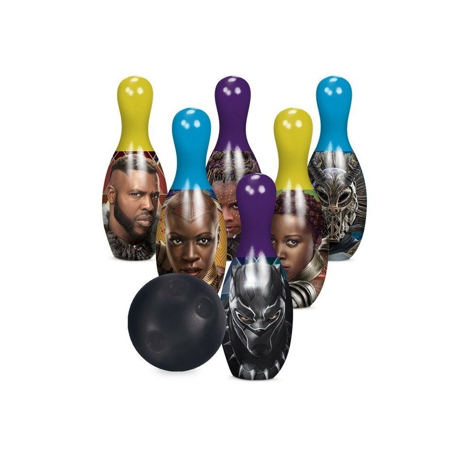 Marvel Black Panther Bowling Set includes 6 Bowling Pins and 1 Bowling Ball.