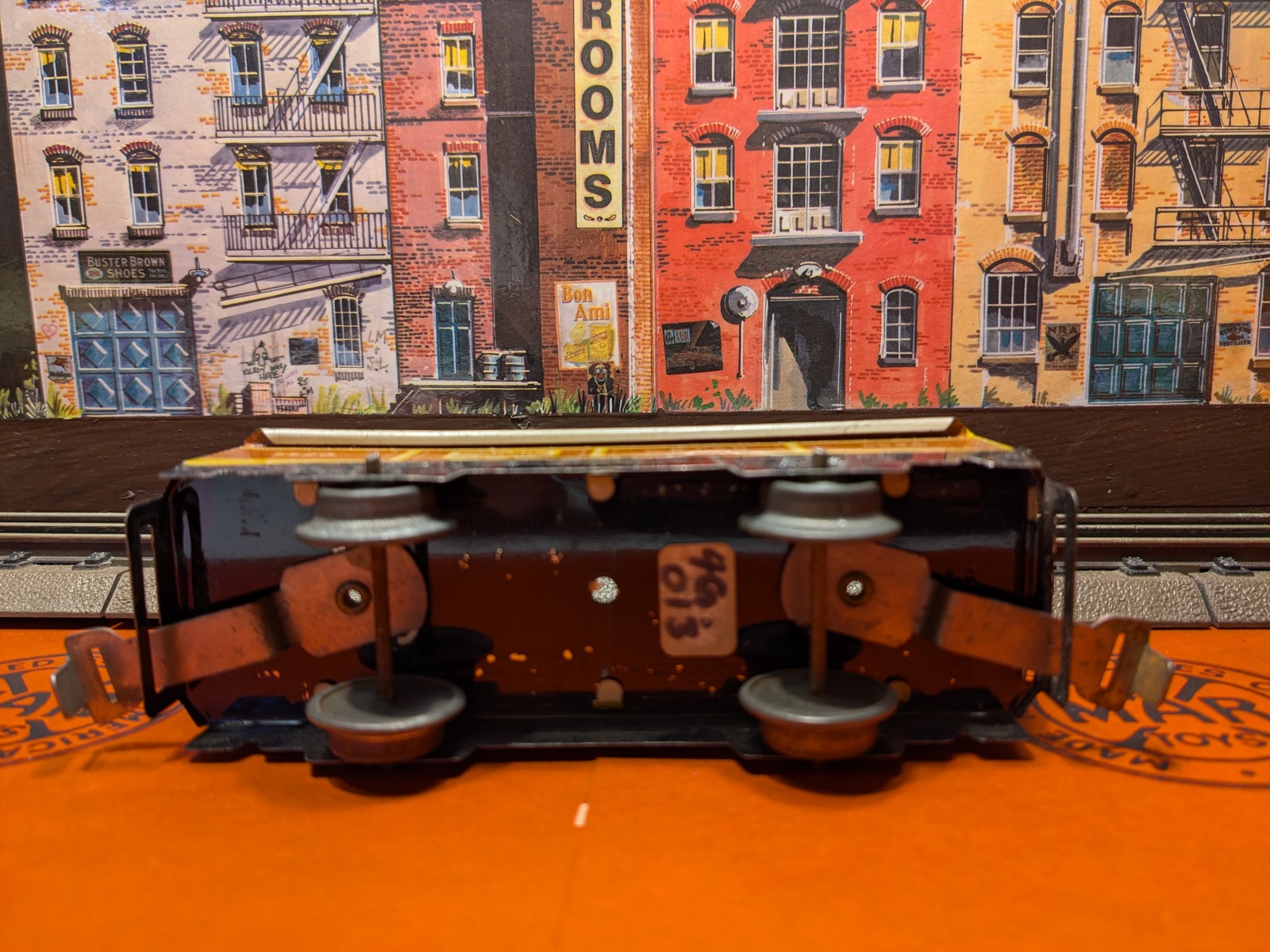 6" inch 4 Wheel Metal Metal Litho C.R.I. P. Rock Groceries and Sundries Gondola #552G Brown Yellow w/Tan Interior Black Frame tab/slot Eyelet Rivet coupler item # lot 2I