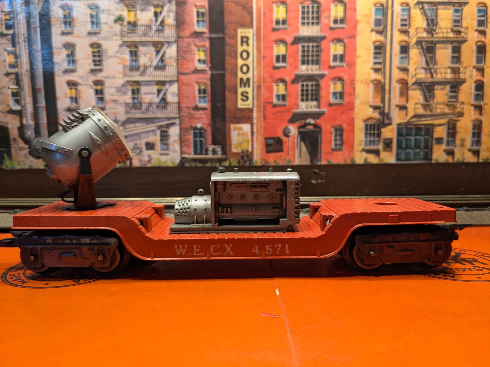 Used #4571B Plastic Deluxe W.E.C.X. Depressed Center Flatcar w/ Silver Generator Searchlight Red Body w/White Lettering Numbers 8 Metal Wheels Type D Trucks Plastic Tilt Automatic Couplers Tested, Spotlight Works BRAKE WHEEL MISSSING Lot# 7I