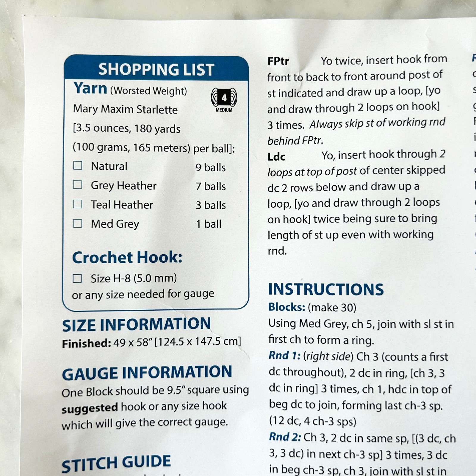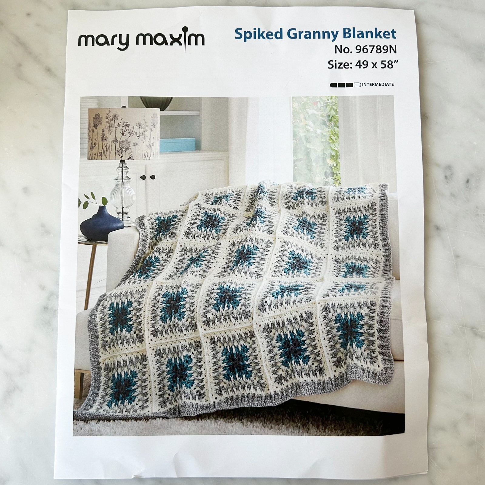 Mary Maxim Spiked Granny Blanket Kit. Updated granny squares and posted stitches in grey heather, teal heather, grey and natural. Kit includes Mary Maxim Starlette yarn. Size 49" x 58". Stitch Requirements: Chain, single crochet, half double crochet, double crochet, repeat, slip, together, yarn over, front post, treble crochet, linked double crochet. Hook Size: H-8 (5 mm) Yarn Range: Mary Maxim Starlette Yarn Range Number: 284 Yarn Weight: 4 Medium Worsted