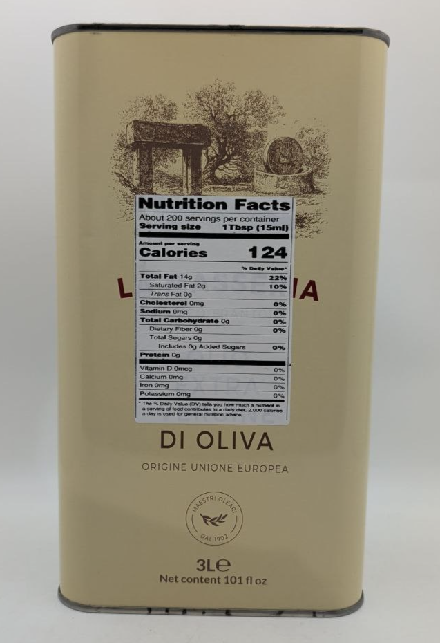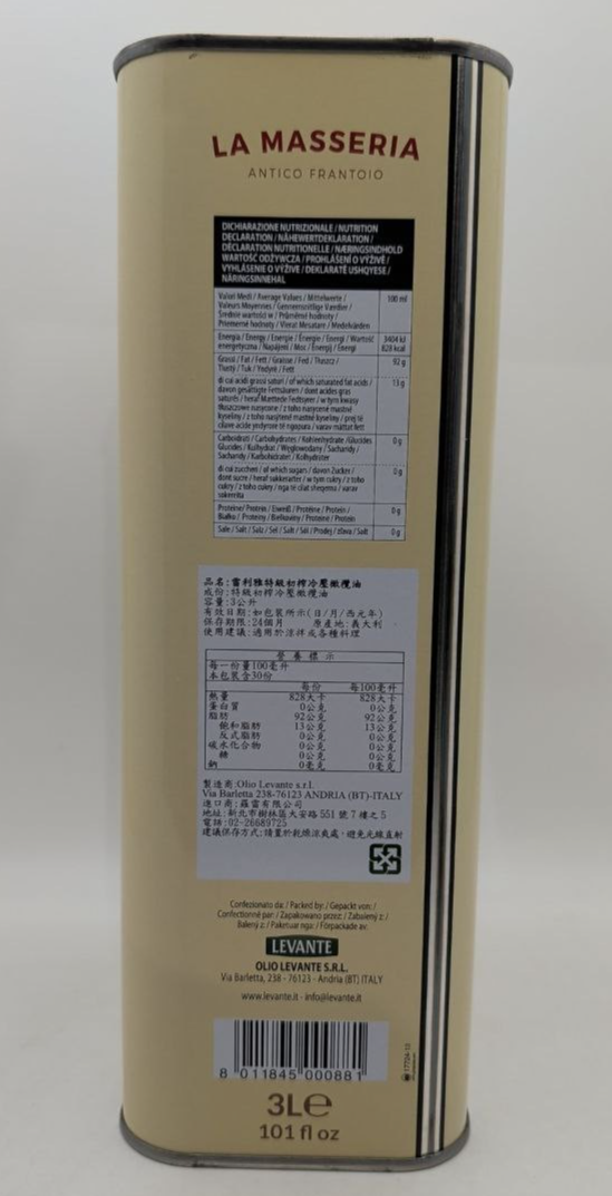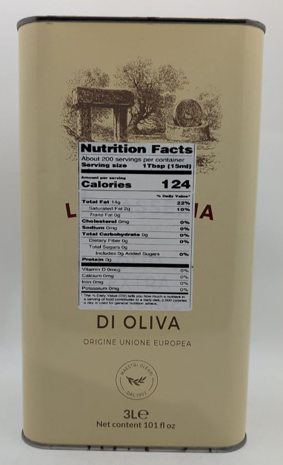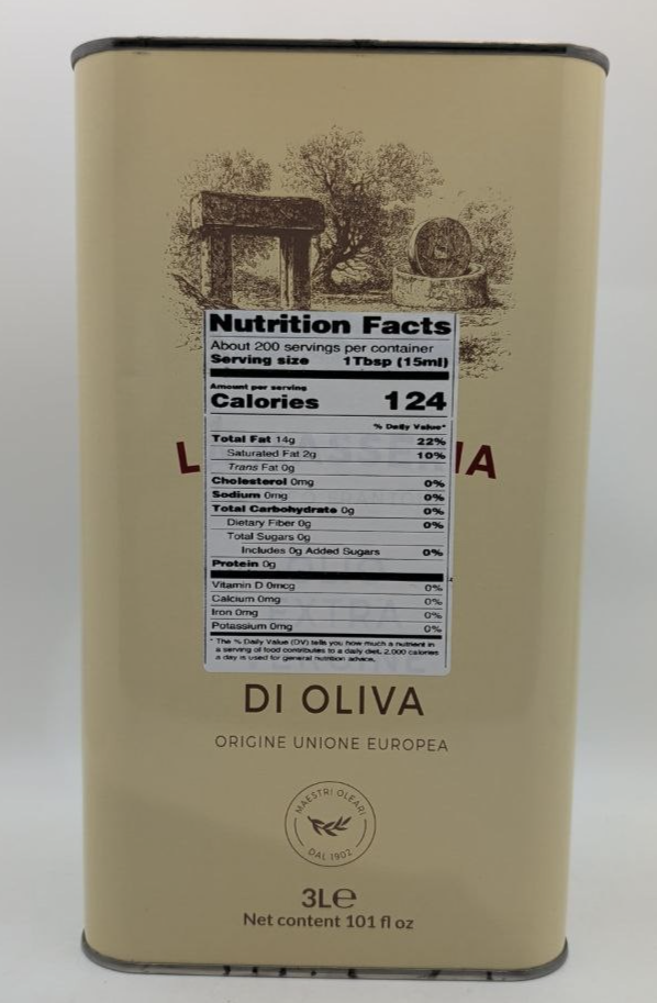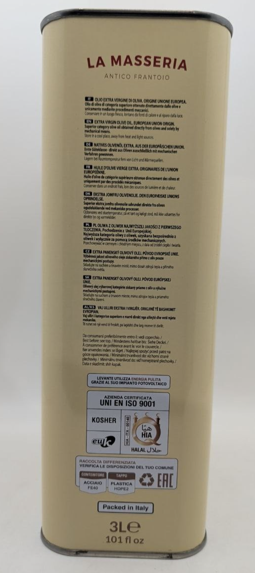 La Masseria Extra Virgin Olive Oil Italy Kosher Halal 101 Oz 3L Cooking Bottle