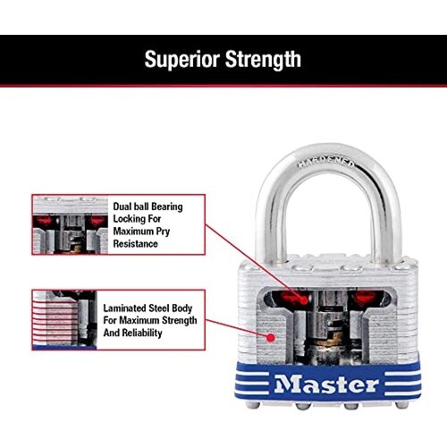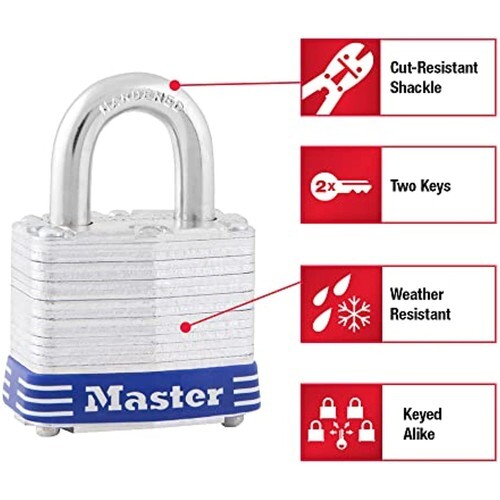 Product Description The Master Lock 3008D Laminated Padlock with Key featurse a 1-9/16 in. (40 mm) wide laminated steel body for maximum strength and reliability. The 9/32 in. (7 mm) diameter shackle is 3/4 in. (19 mm) long and made of hardened steel, offering extra resistance to cutting and sawing. The 4-pin cylinder prevents picking and the dual ball bearing locking mechanism provides maximum pick and pry resistance. The limited lifetime warranty provides peace of mind from a brand you know and can trust. From the Manufacturer Master Lock 3008D 4-Pack of 1-9/16-Inch wide padlocks - keyed alike