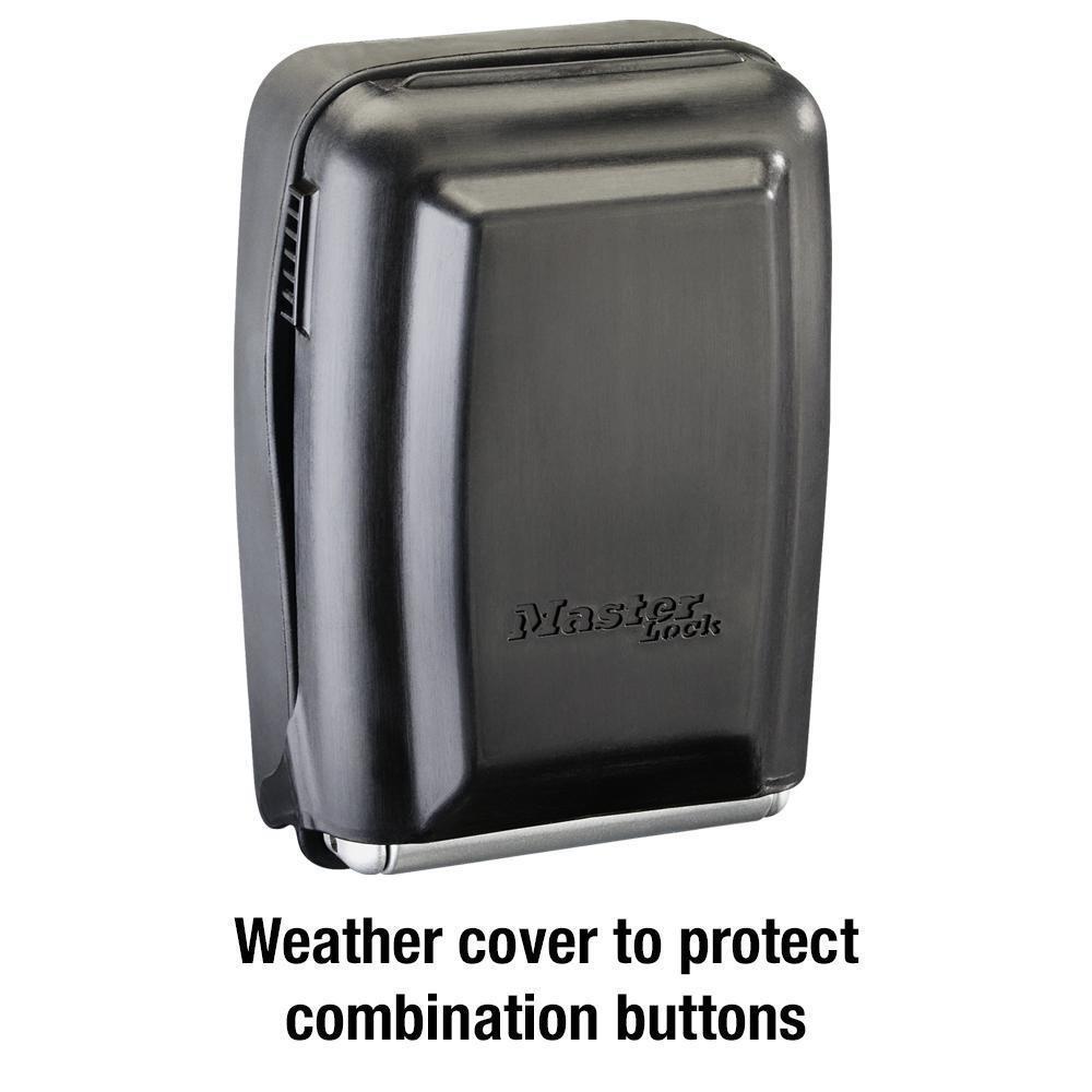 The Master Lock 5423D Wall Mount Push Button Lock Box features a 3-1/8in (79mm) wide metal body for durability. The wall mount design offers permanent installation. Set your own 4 character combination for keyless convenience and increased security. The protective weather cover prevents freezing and jamming; and molded bumper and vinyl coated shackle prevent scratching. The Limited Lifetime Warranty provides peace of mind from a brand you know and can trust.