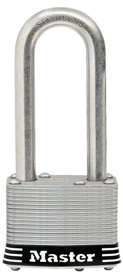 The Master Lock no. 5Sskadlj stainless steel padlock features a 2 inch (51mm) wide laminated stainless steel body for maximum strength, reliability, and weather resistance. The 3/8 inch (10mm) diameter shackle is 2-1/2 inch (64mm) long and made of stainless steel, offering maximum resistance to cutting, sawing, and weather. The 4-pin cylinder prevents picking and the dual locking levers provide resistance against prying and hammering. The lifetime guarantee provides peace of mind from a brand you can trust.