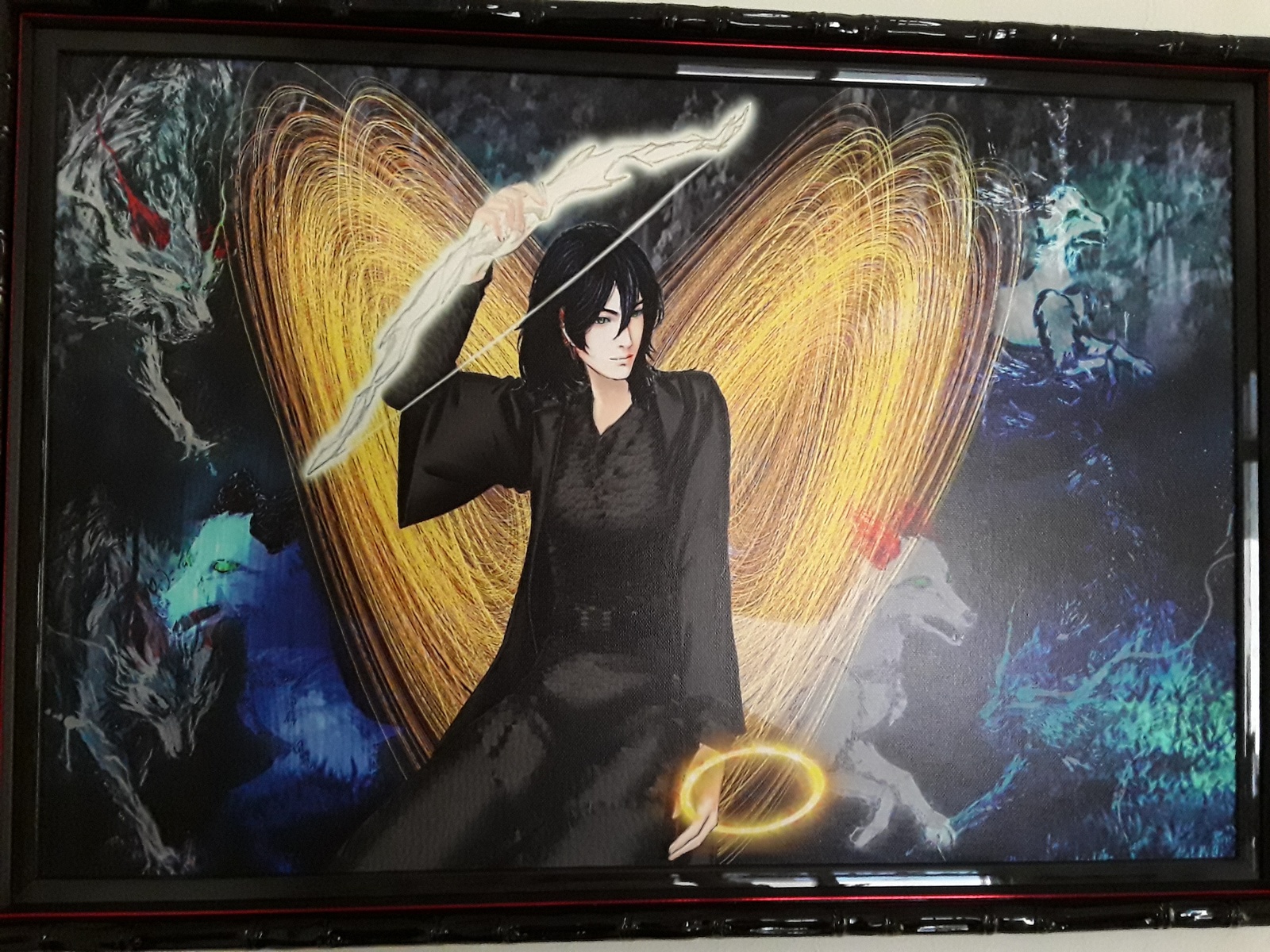 A young man stands in a twilit blue forest. His clothing is dragonscales. Golden wings fan out behind him, gleaming and iridescent. Around him slink six cold white hounds in varied shades of solidity; some sparkling like snow and some hardly visible. His left hand hangs low. Around it spins a shining circle of light. It is his crown, which he is in the habit of playing with. At the moment, it is about to be a dog toy.