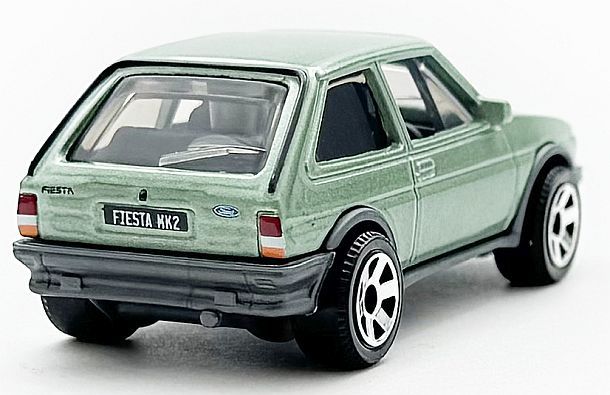 Description: Mtlflk Light Green w/Black interior; Smoke windows; Detailed head taillights; White 'Fiesta MK2' on rear license plate; Ford emblem on rear hood; Dark Gray Thailand base w/Chr6SPS's. 080325-080325T-D43