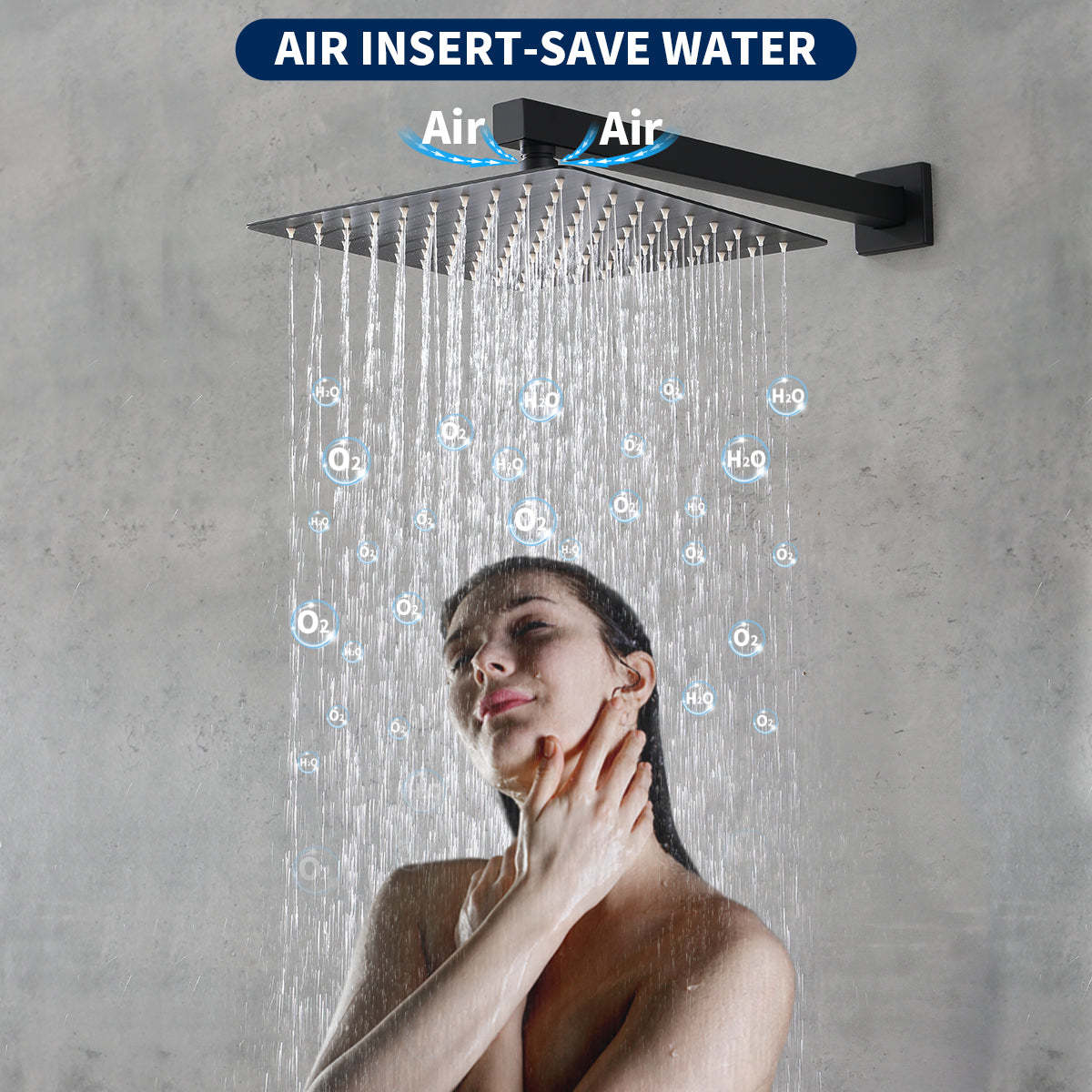 ?Air Inject Technology: Inject the air into rain shower head to mix with water, and boost the water pressure up to 2.5GPM instantly. Works well in both high and low water pressure area, and avoid wasting much water while providing smooth and strong water flow.