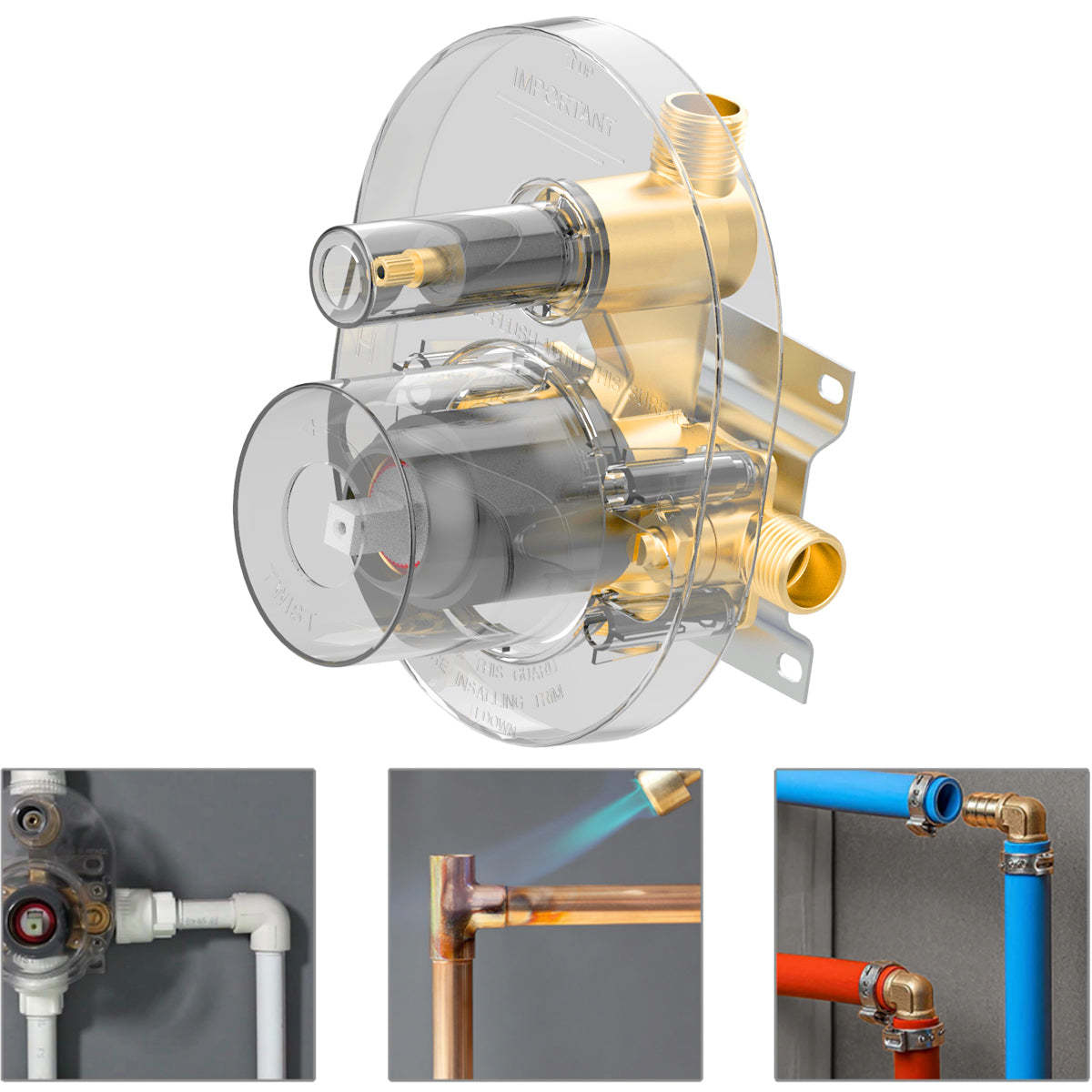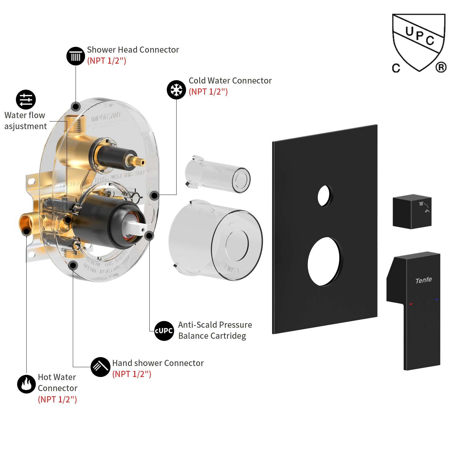 ?Water Flow Pressure Control: Brass shower valve kit can effectively avoid annoying water hammer by adjusting flow rate automatically. the cUPC Certified built-in cartridge can monitor and balance water temperature and pressure, protect you from being scalded by the sudden changes on water. Tenfe rain shower system are in compliance with the following standard(s): ASME A112.18.1-2018/CSA B125.1-18