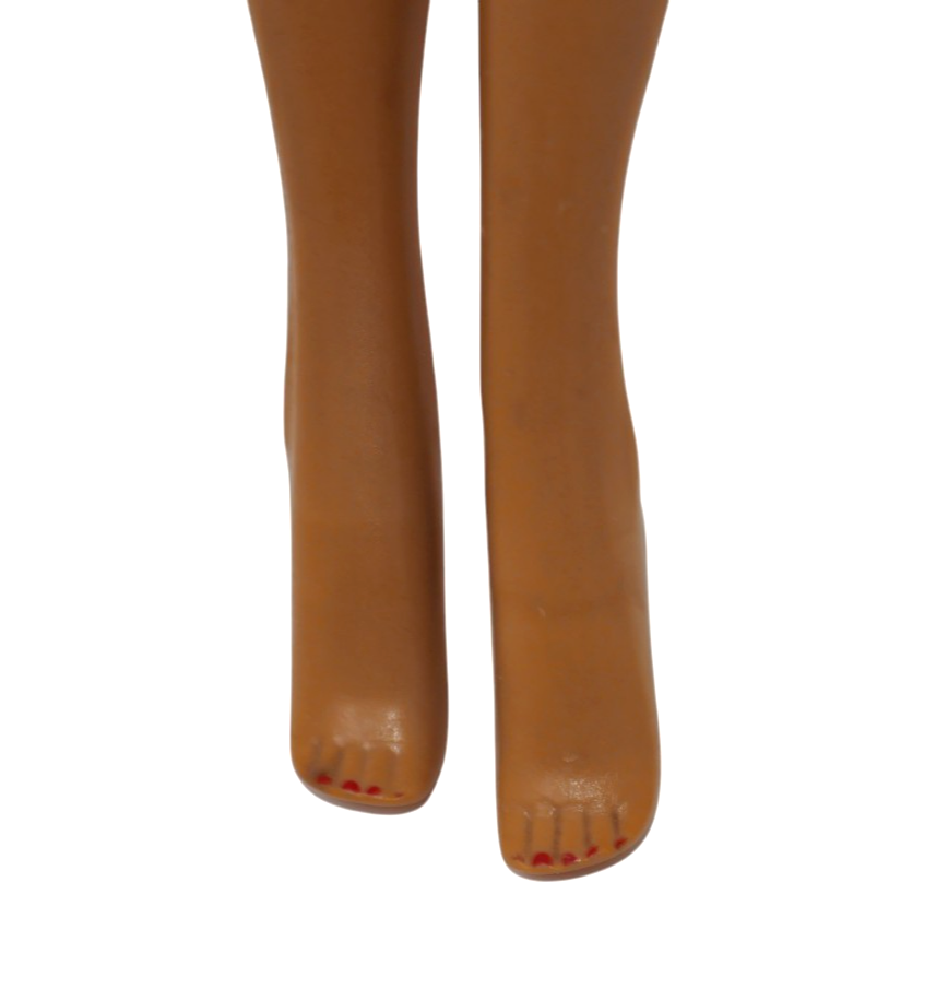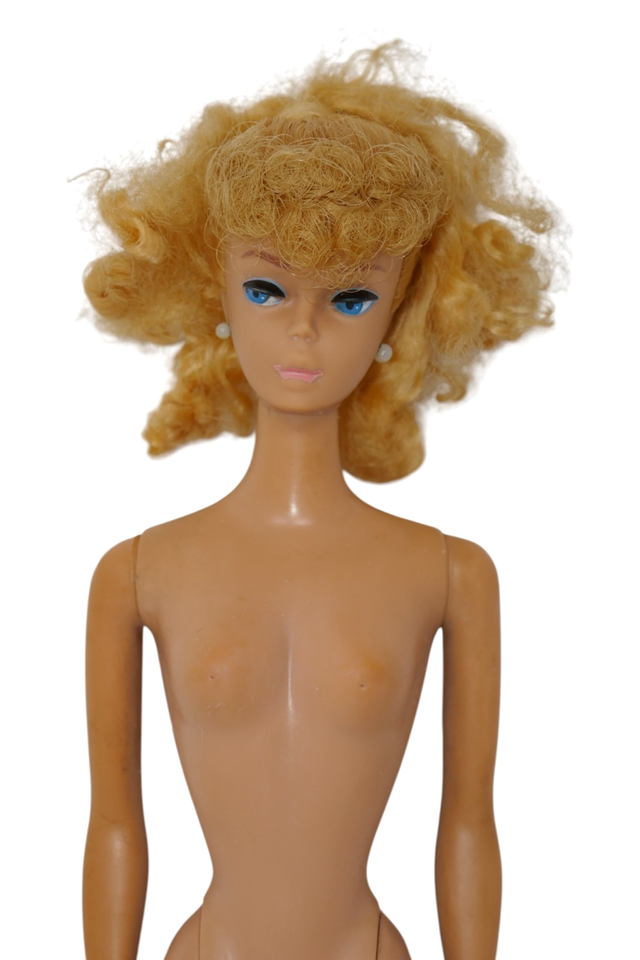 This Vintage 1962 Ponytail Barbie Doll #6 in Ash Blonde with its curly hair, blue eyes, light complexion, and 11-inch size is a classic piece of fashion doll history. She does have some signs of aging, and marks on her body. She has a slight green tint on her ears, her body has discoloring in areas with two tiny holes on her breasts and small slit on her crotch area. The polish is fading on her fingers and toes, as is the lipstick on her lips. Her bangs are somewhat stiff and the rubberbands that held the ponytail have disintegrated. Her left but cheek says B117 and her right says Barbie Pats, Pend. MCMLVIII by Mettel Inc. Her right foot says Japan with possible numbers under the toes. The red bathing suit has stains but we did not attempt to clean them. This Barbie is a valuable addition to any doll collection, showcasing the iconic character of Barbie with its original features and design from the 1960s.